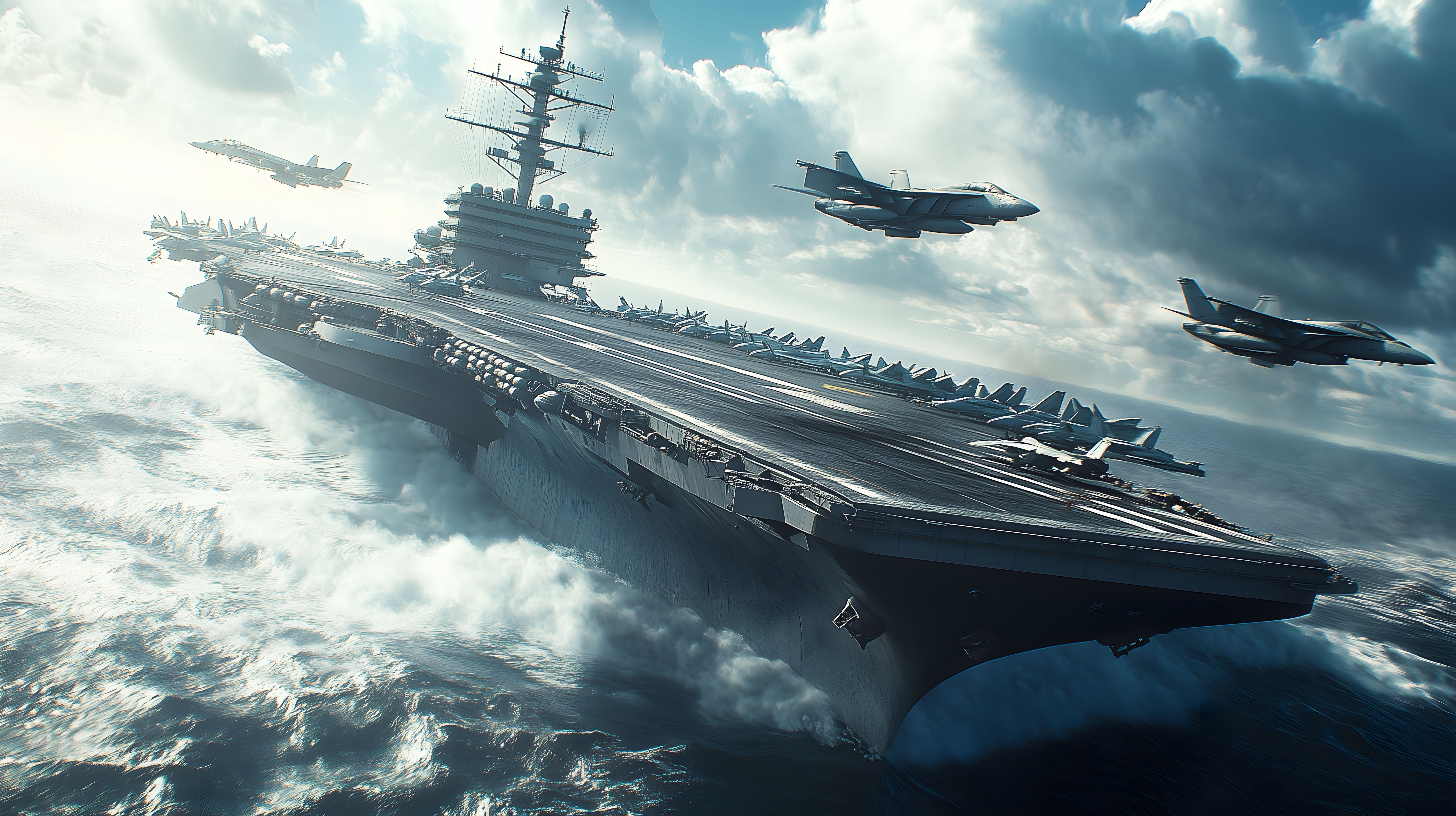 Das beeindruckende Bild zeigt einen mächtigen Flugzeugträger, umgeben von dramatischen Sturm- und Gewitterwolken am düsteren Himmel. Startende Kampfjets verlassen das imposante Schiff, das wie ein Symbol für militärische Stärke und globale Machtprojektion wirkt. Das Foto vermittelt eine Atmosphäre von Spannung, Abenteuer und Bedrohung. Dieses Hochauflösungsfoto eignet sich hervorragend für Veröffentlichungen zu Themen wie Militär, Verteidigung, Sicherheitspolitik oder Action-orientierte Medieninhalte. Als kostenloses Stockfoto unter der Creative-Commons-Lizenz ist es leicht und rechtssicher einsetzbar.