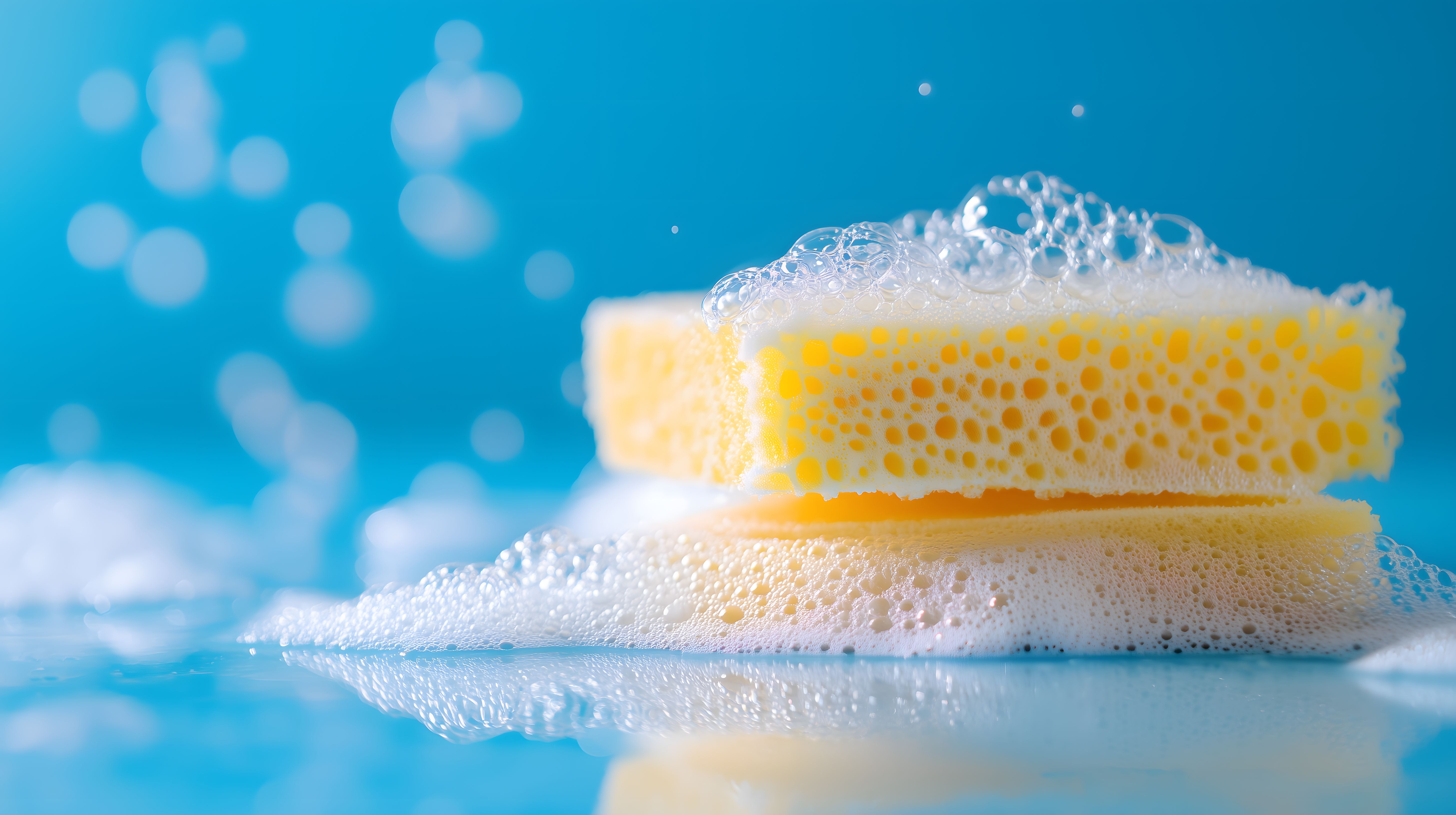 Dieses Foto zeigt einen Fokus auf zwei gelbe Schwämme, die in einem blauen Wasser schweben. Die Schwämme sind von weißen Seifenblasen umgeben, die eine wunderschöne, schwebende Textur und Reflektion in der glatten Wasseroberfläche erzeugen. Die klare, einfache Komposition und die lebendigen Farben machen dieses Bild zu einem perfekten kostenlosen Stockfoto für den Einsatz in Blogs, Newslettern, Social-Media-Posts oder Werbematerialien mit einem sauberen, minimalistischen und modernen Designstil. Das Foto ist in hoher Auflösung verfügbar und unter einer Creative-Commons-Lizenz frei verwendbar.