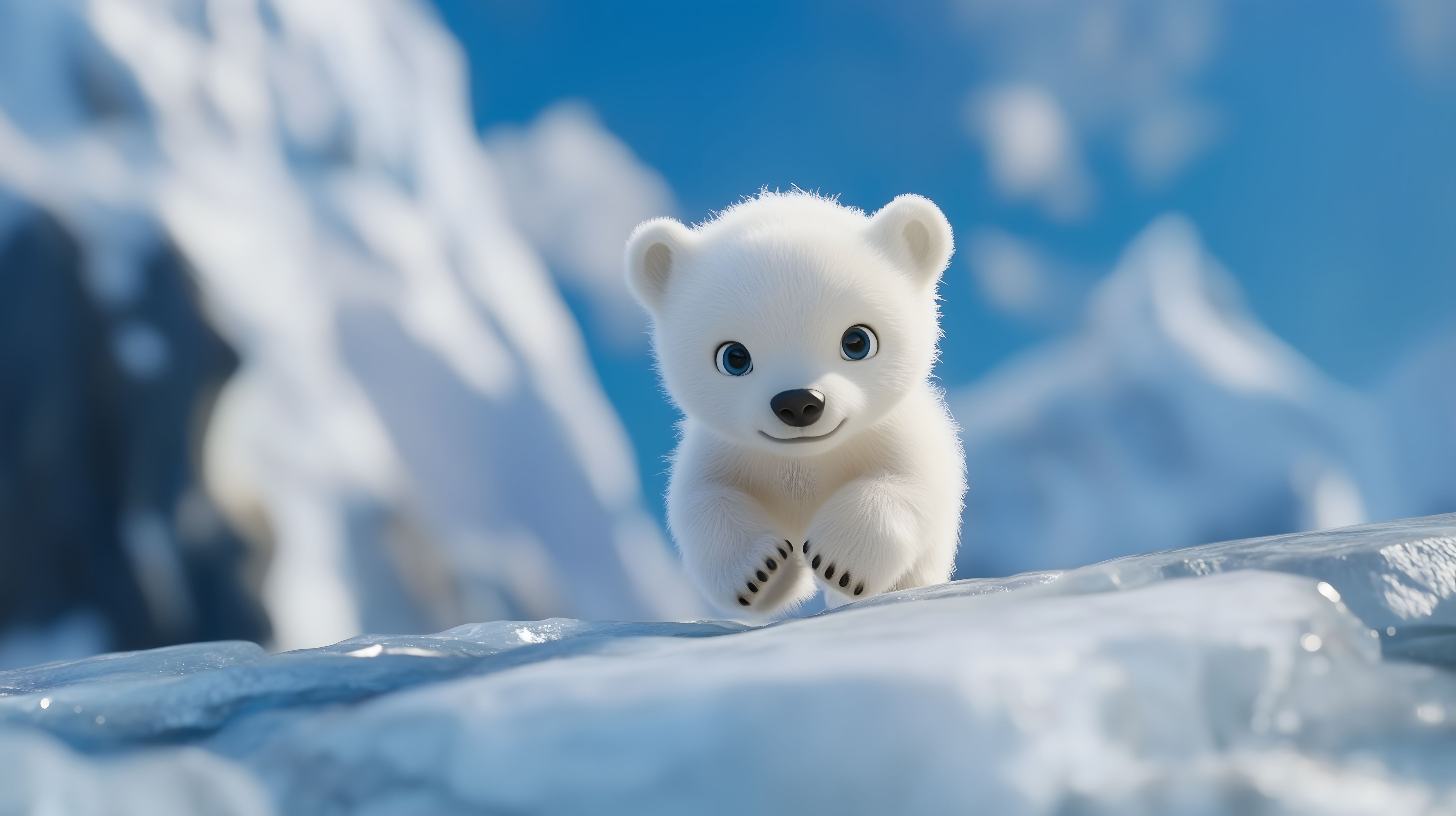 Das Foto zeigt ein entzückendes Eisbärjunges, das inmitten einer winterlichen Landschaft aus Eis und Schnee sitzt. Mit seinen großen, dunklen Augen und dem flauschigen weißen Fell sieht das kleine Bärchen unglaublich niedlich und verspielt aus. Im Hintergrund erstreckt sich eine beeindruckende Berglandschaft mit blauem Himmel und Wolken, die eine idyllische Szenerie schaffen.
