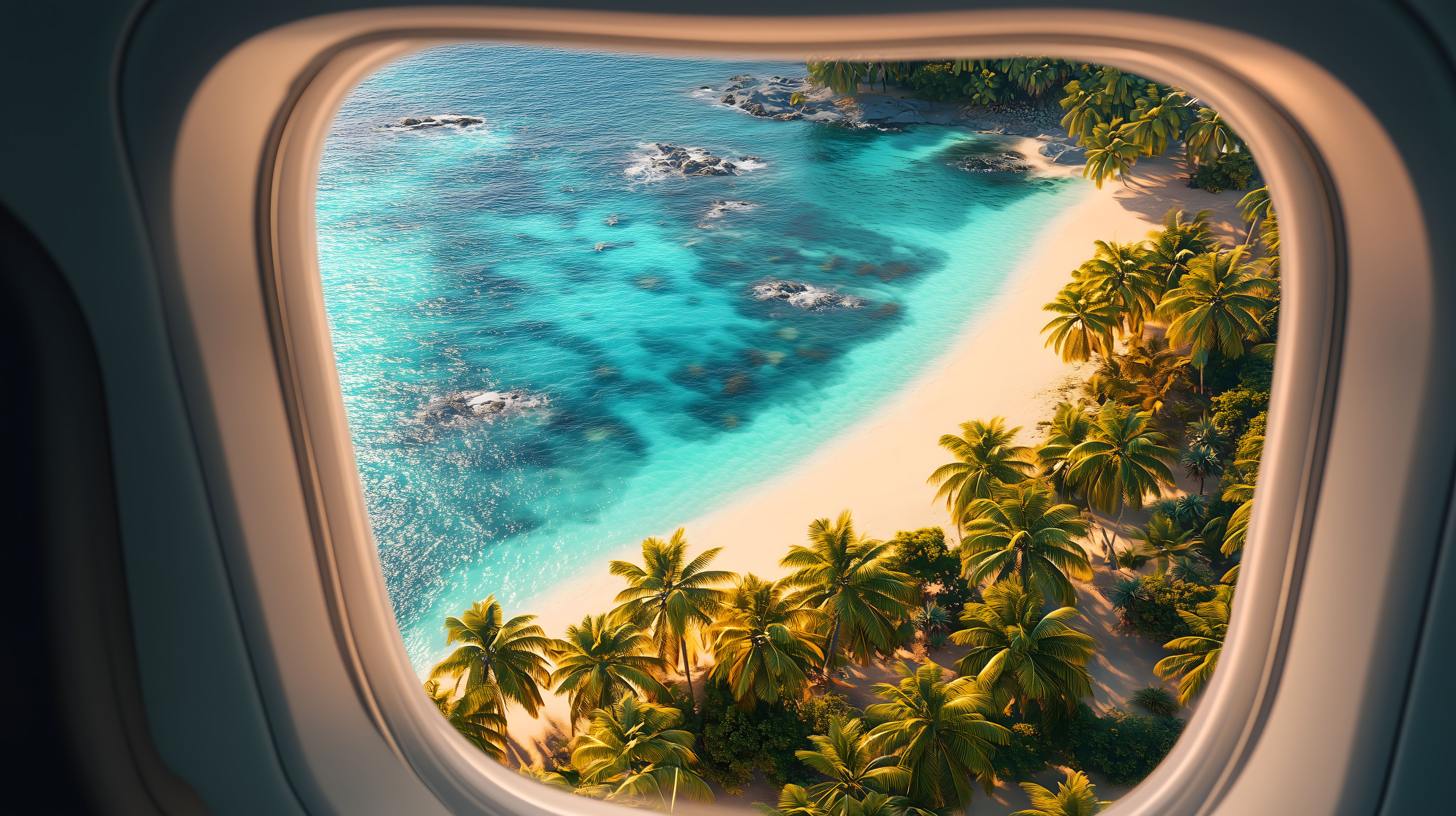 Dieses faszinierende Foto zeigt eine traumhafte tropische Insellandschaft, wie man sie sich im Paradies vorstellt. Aus dem Fenster eines Flugzeugs eröffnet sich ein atemberaubender Blick auf einen endlosen, türkisfarbenen Ozean, der von einem malerischen Sandstrand und einer dichten Palmenkulisse gesäumt wird. Die warmen Farbtöne, die sanften Formen und die friedliche Stimmung machen dieses Bild zu einem perfekten Motiv für Blog-Beiträge, Newsletter-Grafiken, Social-Media-Posts oder Werbematerial rund um das Thema Reisen, Urlaub und Entspannung. Als kostenloses Stockfoto in hoher Auflösung und unter Creative-Commons-Lizenz eignet es sich hervorragend für verschiedenste visuelle Projekte.