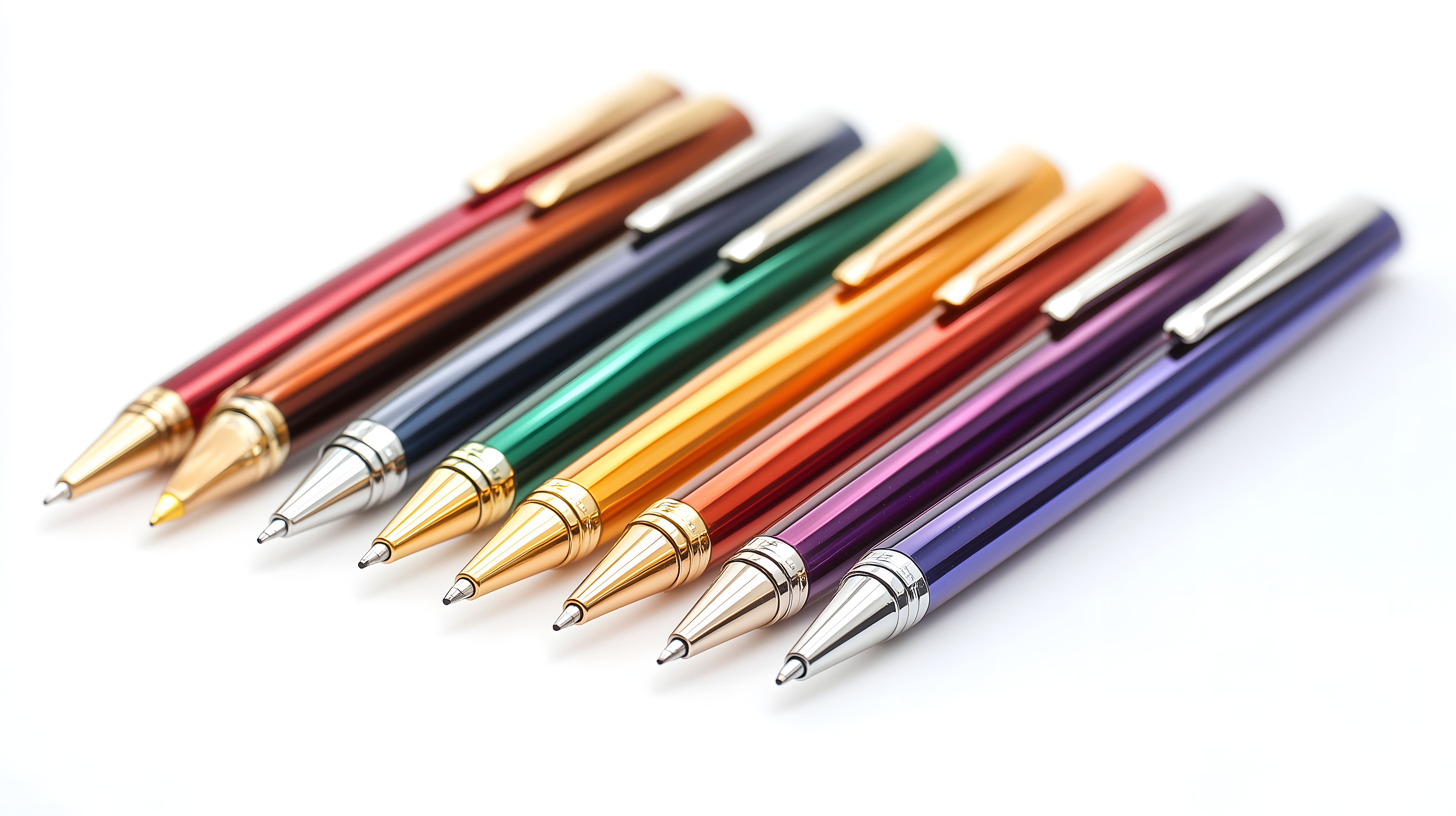 Das Bild zeigt eine Reihe von farbigen Kugelschreibern, die vor einem weißen Hintergrund platziert sind. Die Stifte erstrecken sich über den gesamten Bildbereich und präsentieren eine bunte Palette an Farben, die vom Rot über Gelb, Grün und Blau bis hin zu Lila reichen. Die Anordnung der Stifte ist symmetrisch und wirkt aufgeräumt, was den Eindruck von Ordnung und Struktur vermittelt. Dieses Foto eignet sich hervorragend als kostenloses Stockfoto für den Einsatz in Blogbeiträgen, Newslettern, auf Social-Media-Kanälen oder in Werbematerialien rund um die Themen Büroausstattung, Kreativität, Schreiben und Zeichnen. Das Bild ist in hoher Auflösung verfügbar und steht unter einer Creative-Commons-Lizenz zur Verfügung.