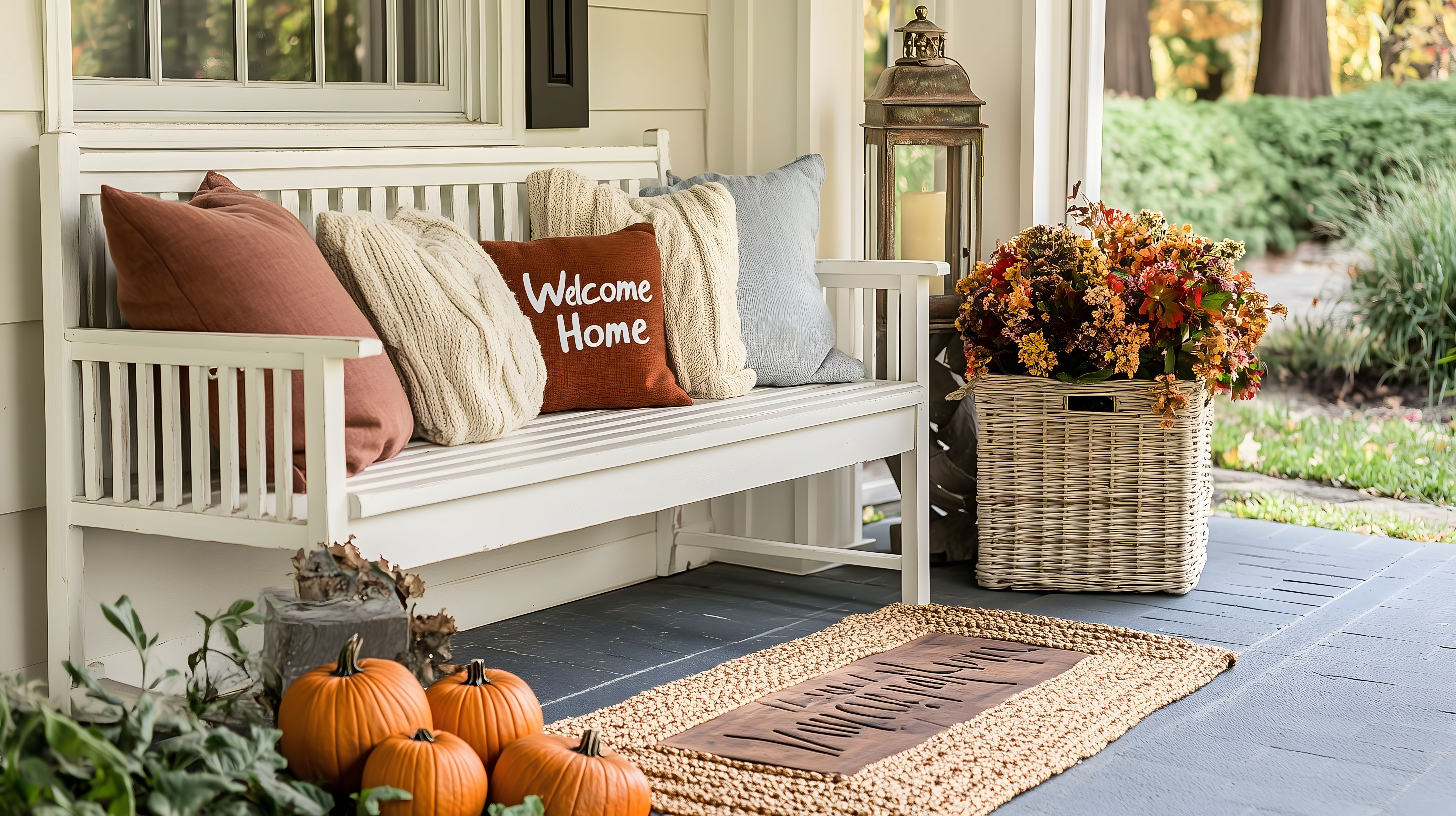 Dieses gemütliche Foto zeigt eine herbstlich dekorierte Veranda im Landhausstil. Der Blick fällt auf eine weiße Sitzbank, die mit bunt gemusterten Kissen und einem Kissen mit der Aufschrift 'Welcome Home' geschmückt ist. Davor stehen einige orange Kürbisse und ein Korb voller herbstlicher Blumen. Eine alte, bronzefarbene Laterne erhellt die Szenerie. Der Bodenbelag besteht aus Holz und einer rustikalen Fußmatte. Im Hintergrund sind grüne Pflanzen und ein Garten zu sehen. Das Foto vermittelt eine warme, einladende Atmosphäre und eignet sich ideal als Stockfoto für Blogbeiträge, Newsletter oder Werbematerial rund um das Thema Herbstdekoration, Zuhause und Gemütlichkeit. Das hochauflösende Bild steht unter einer Creative-Commons-Lizenz kostenlos zum Download zur Verfügung.