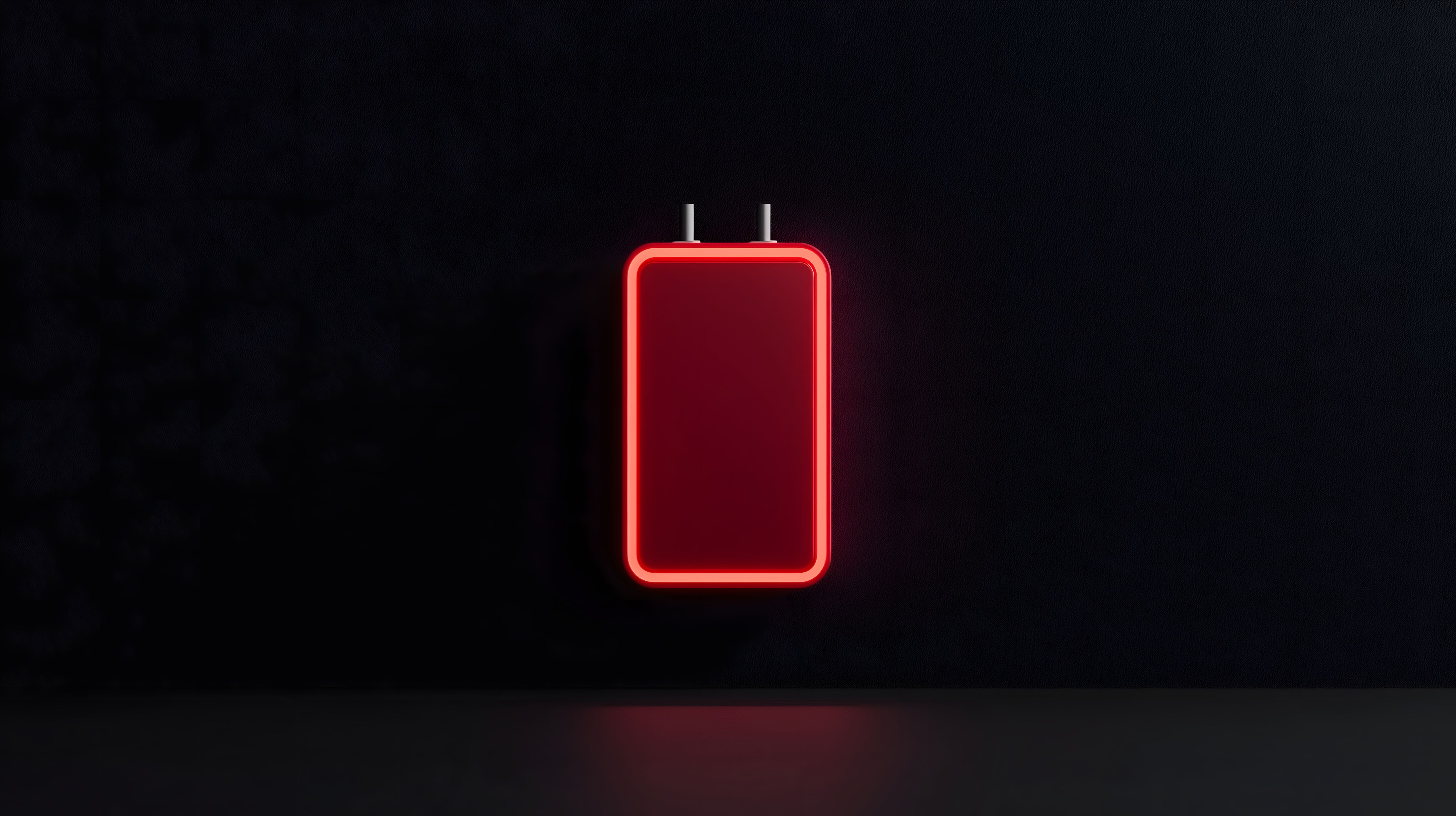 Das Bild zeigt ein leuchtendes, rotes Batteriesymbol vor einem dunklen Hintergrund. Das Symbol erscheint minimalistisch und reduziert, wodurch die Formen und die intensive Farbgebung in den Vordergrund treten. Das Rot des Symbols sticht kontrastreich vom schwarzen Hintergrund ab und verleiht dem Bild eine starke visuelle Wirkung.