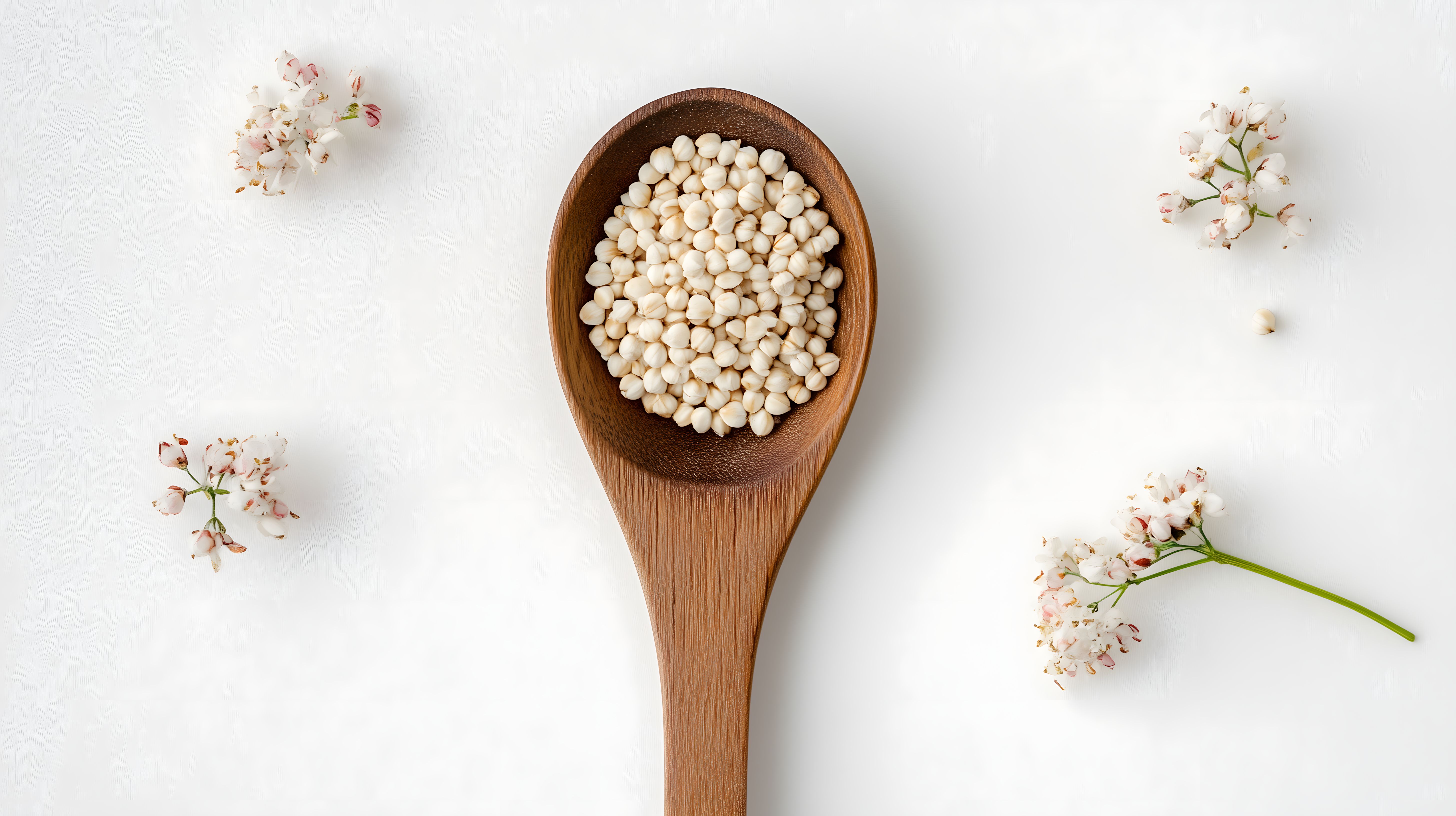 Dieses Foto zeigt einen Holzlöffel gefüllt mit frischen Buchweizen-Körnern auf weißem Hintergrund. Umrahmt wird das Bild von dekorativen weißen Blüten, die eine natürliche und ruhige Atmosphäre schaffen. Das rustikale Design des Holzlöffels und die makellose Präsentation der Zutaten machen dieses Bild zu einem idealen Motiv für Rezepte, Kochbücher, Lebensmittelwerbung oder kulinarische Blogbeiträge. Als kostenloses Hochauflösungsfoto unter Creative-Commons-Lizenz eignet es sich hervorragend für vielfältige Einsatzzwecke in Print und Digital.