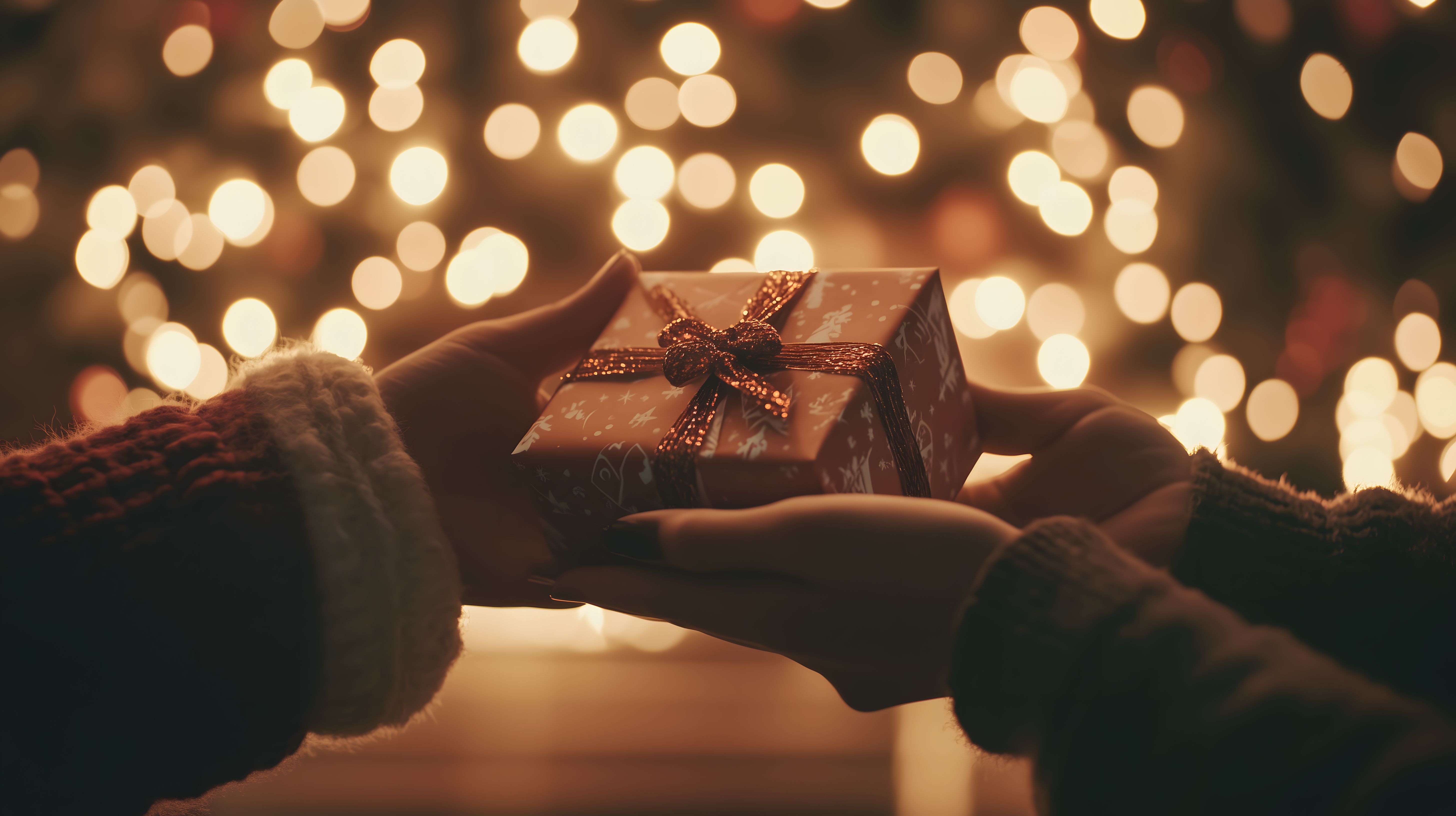 Dieses stimmungsvolle Foto zeigt eine Nahaufnahme eines festlich verpackten Geschenks vor einem Hintergrund aus verschwommenen Lichterketten. Die warme, goldene Beleuchtung verleiht der Szene einen gemütlichen und besinnlichen Charakter. Die Perspektive und Komposition lenken den Fokus direkt auf das Geschenk und seine aufwendige Verpackung mit Schleife. Dieses Bild eignet sich hervorragend als Hintergrund oder Dekor für Weihnachten, Geburtstage oder andere Feiertage in Blogs, Newslettern oder sozialen Medien. Es ist ein kostenloses Stockfoto in hoher Auflösung unter Creative-Commons-Lizenz.
