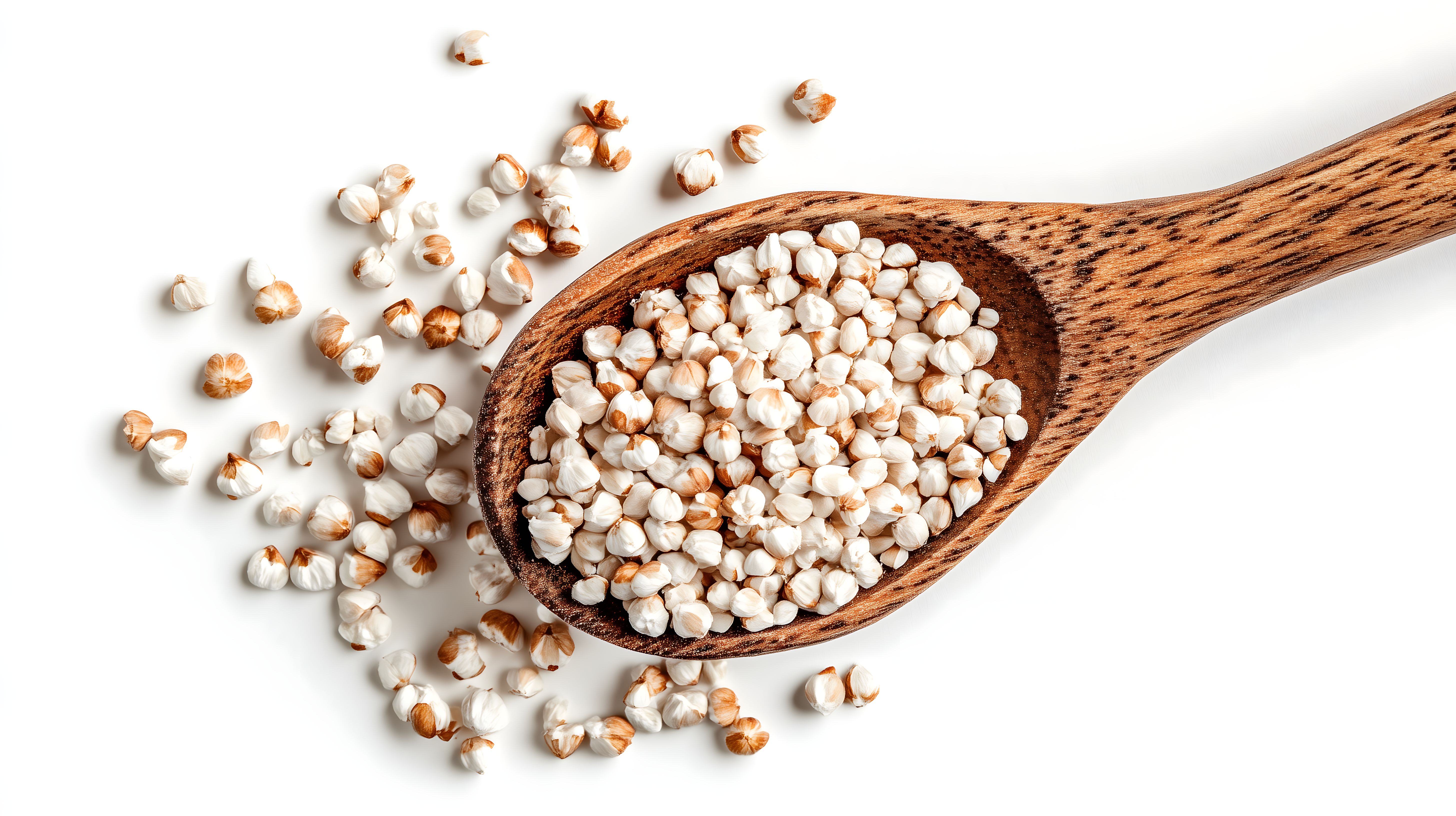 Dieses attraktiv arrangierte Foto zeigt eine Nahaufnahme von Buchweizenkörnern, die in einem hölzernen Löffel auf weißem Hintergrund liegen. Die Körner haben eine natürliche, leicht bräunliche Farbe und sind dekorativ über den Löffel verteilt. Das Bild strahlt einen rustikalen, natürlichen Charakter aus und eignet sich perfekt für den Einsatz in Kochblogs, Rezeptsammlungen, sowie für Werbung und Social-Media-Beiträge rund um gesunde, glutenfreie Ernährung. Als hochwertiges, kostenloses Stockfoto unter einer Creative-Commons-Lizenz ist es leicht in verschiedenste Projekte integrierbar.