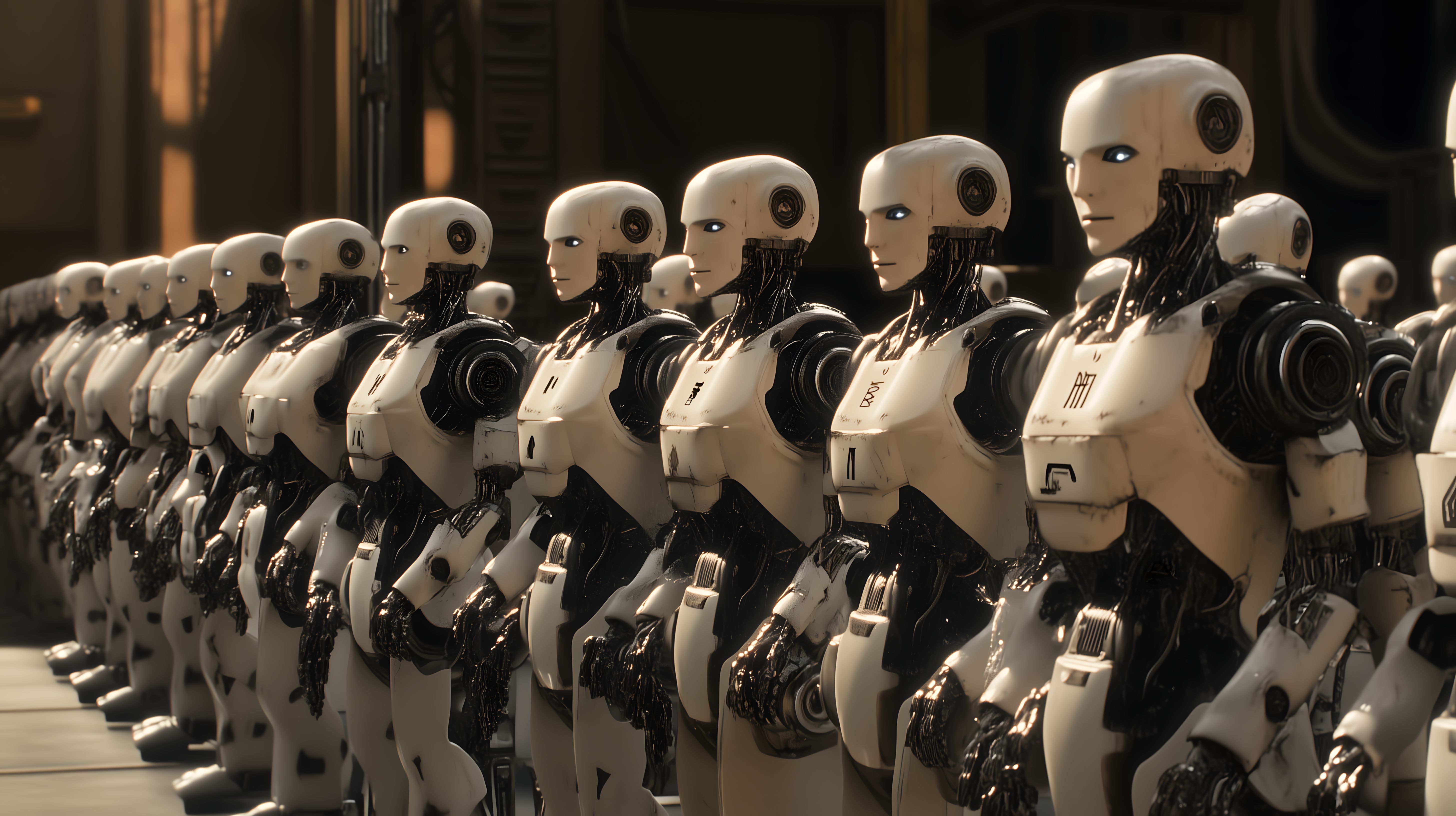 Das Bild zeigt eine Armee von humanoiden Robotern, die in einer düsteren, futuristischen Umgebung stehen. Die Roboter sind in einer Reihe aufgestellt und blicken starr geradeaus, was eine beklemmende, fast bedrohliche Atmosphäre schafft. Die Kombination aus den technisch-industriellen Formen der Roboter und der dunklen, dystopischen Szenerie lässt eine Welt erahnen, in der Maschinen die Kontrolle übernommen haben. Dieses Bild wäre ideal für Science-Fiction-Projekte, Artikel über Technologie und Innovationen, aber auch für Illustrationen von Zukunftsszenarien in Werbung und Marketing. Als hochwertiges, kostenloses Stockfoto in hoher Auflösung und mit einer Creative-Commons-Lizenz kann es vielseitig eingesetzt werden.