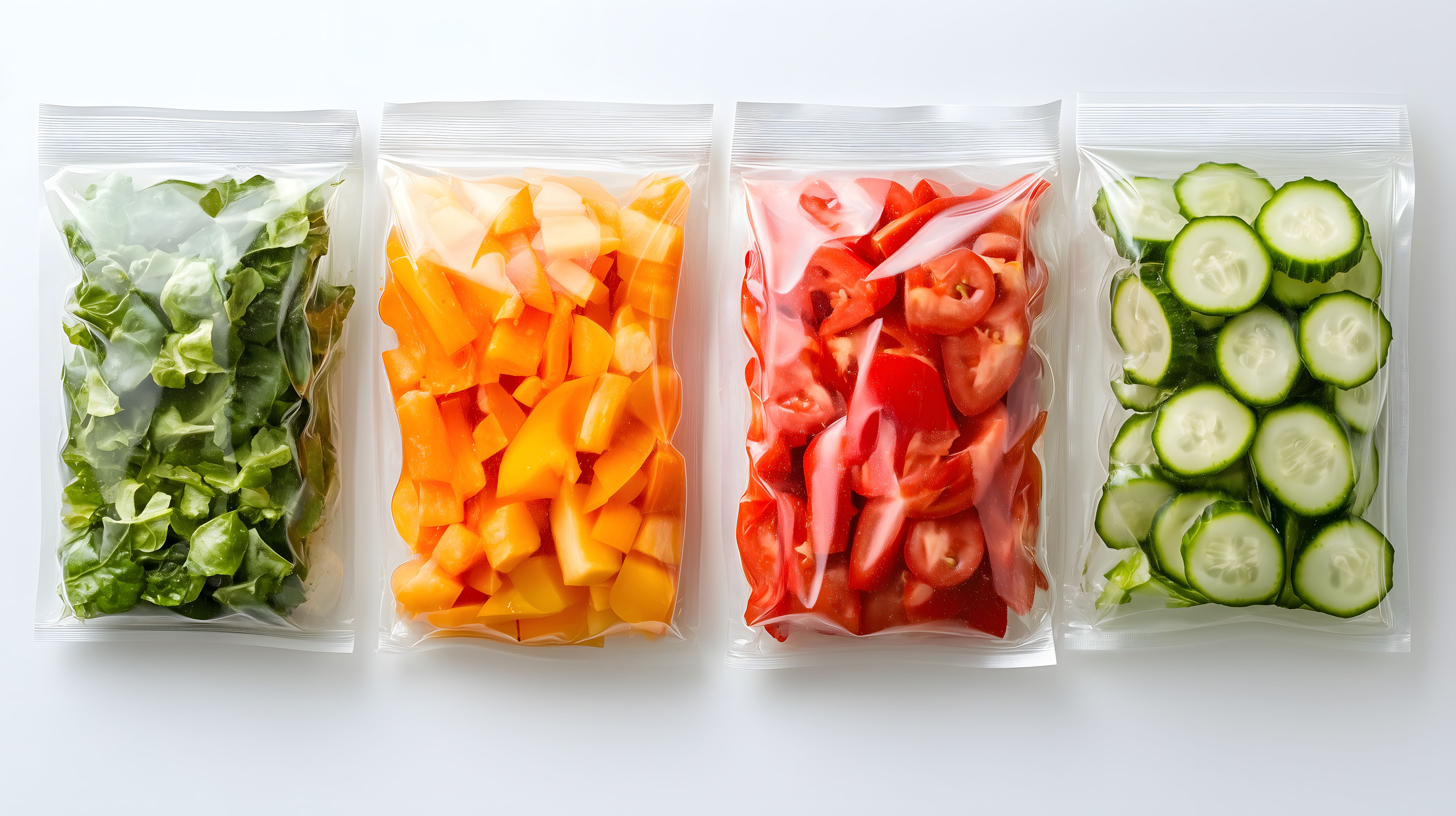 Dieses Foto zeigt verschiedene Gemüsewürfel in transparenten Plastikbeuteln. Es sind Würfel von Tomaten, Gurken, Möhren und grünem Salat zu sehen. Die Zutaten sind auf einem weißen Hintergrund angeordnet, was die Frische und Natürlichkeit des Gemüses betont. Das Bild eignet sich hervorragend als Stockfoto für Beiträge zu gesunder Ernährung, Kochrezepte oder Food-Blogs. Mit seiner minimalistischen Gestaltung und hoher Auflösung steht es unter der Creative-Commons-Lizenz zur kostenlosen Verwendung zur Verfügung.