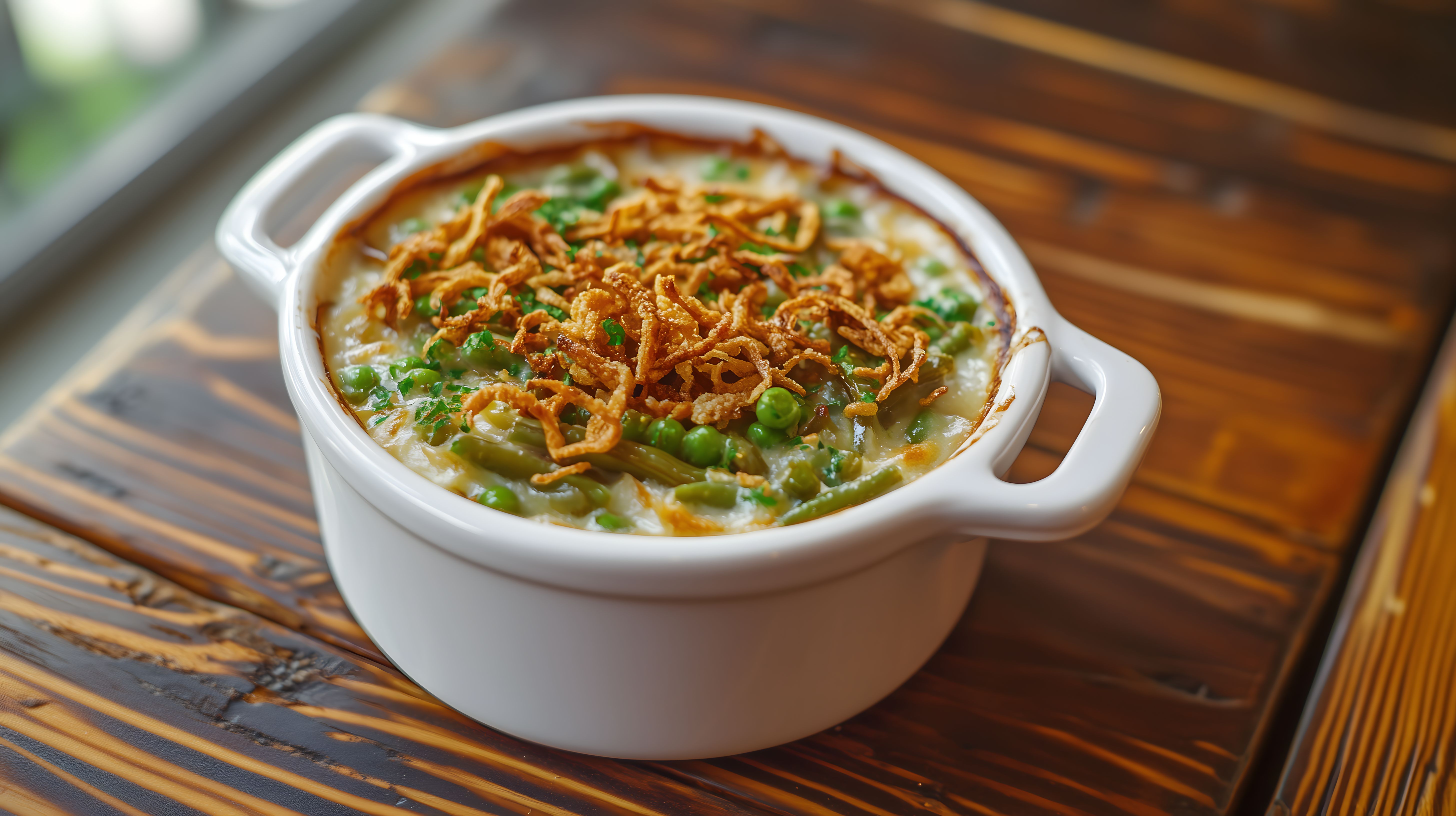 Dieses appetitliche Foto zeigt einen knusprig überbackenen Bohnentopf in einer weißen Schale, serviert auf einem rustikalen Holztisch. Die grünen Bohnen sind in einer cremigen, würzigen Sauce eingebettet und mit knusprigen, frittierten Zwiebeln oder Röstzwiebeln garniert. Das Gericht strahlt Gemütlichkeit und Genuss aus und könnte perfekt für ein gesundes Mittag- oder Abendessen verwendet werden. Dieses hochauflösende Stockfoto in kostenlosen Creative-Commons-Lizenzen eignet sich hervorragend für Blogs, Websites, Newsletter oder Social-Media-Beiträge rund um das Thema Kochen, Rezepte und gesunde Ernährung.