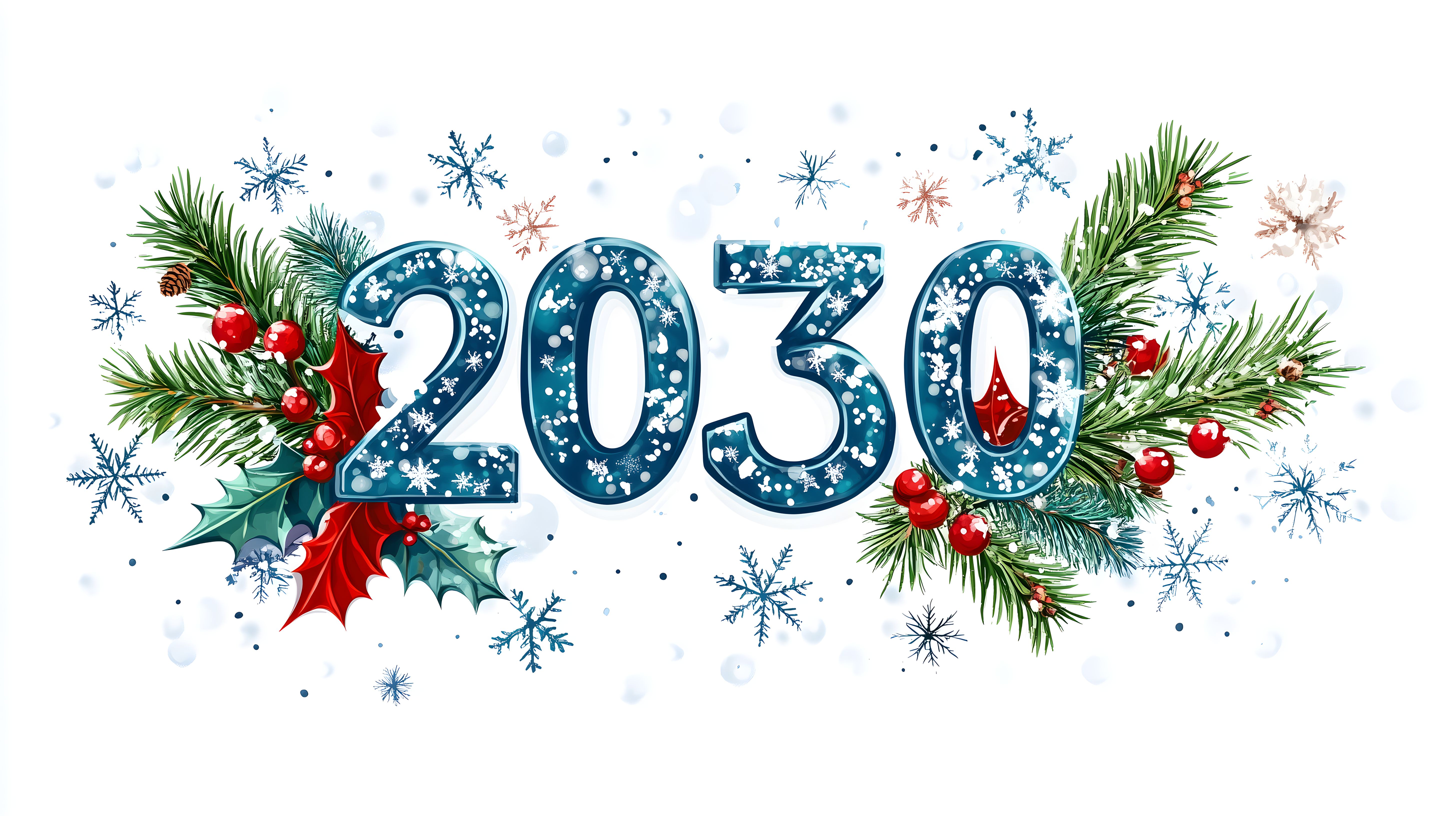 Dieses winterliche Illustration zeigt eine dekorative Anordnung von Tannenzweigen, Schneeflocken und roten Beeren, die das Jahr 2030 umrahmen. Die Farben in Blau, Grün und Rot verleihen der Szene eine festliche, aber auch frostige Stimmung. Das Bild eignet sich hervorragend als kostenfreies Stockfoto für Weihnachts- oder Neujahrskampagnen, Blogs, Newsletter und Werbematerialien in hoher Auflösung unter Creative-Commons-Lizenz.