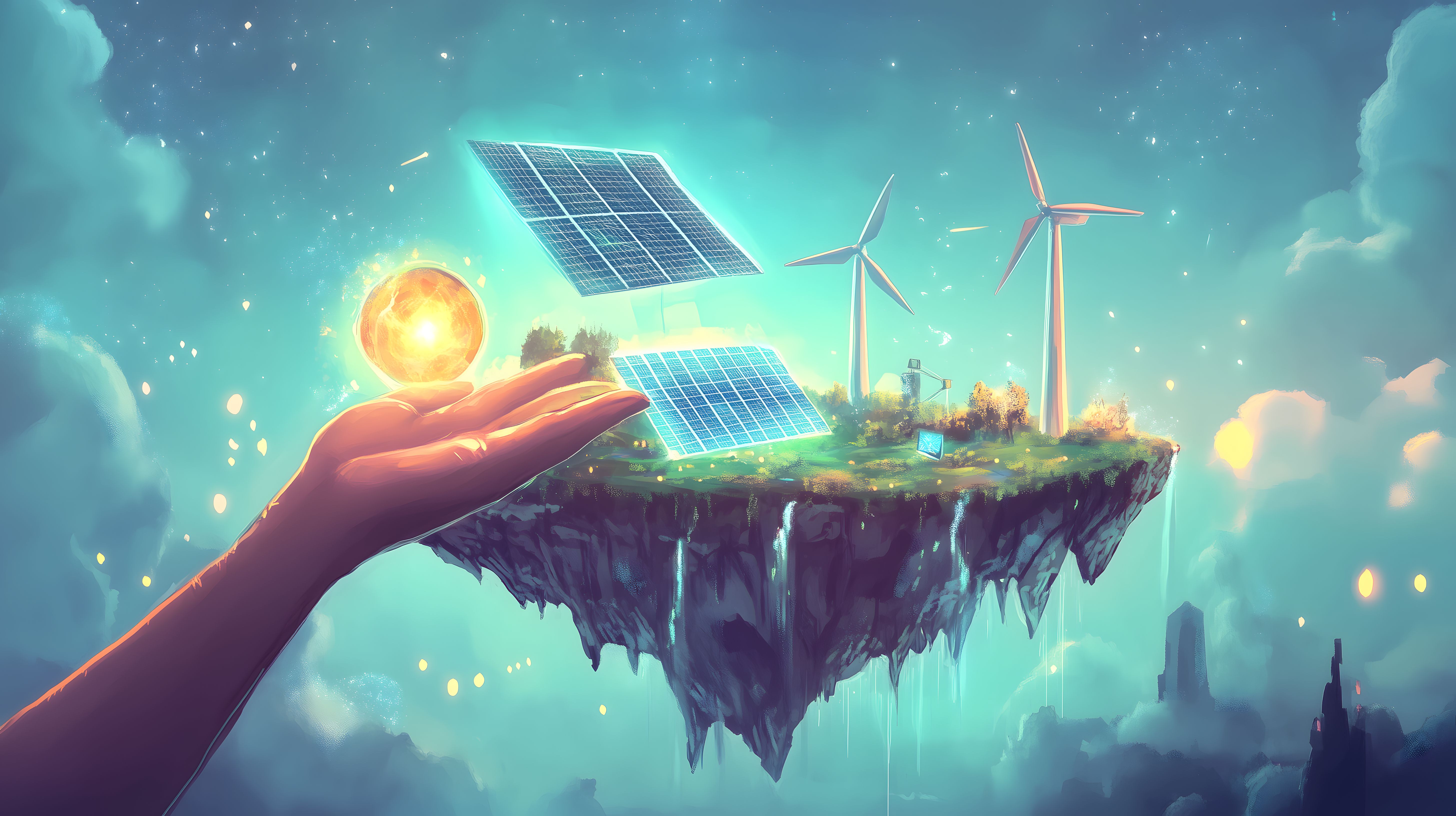 Dieses beeindruckende, digitale Bild zeigt eine schwebende Insel, die von einer Vielzahl erneuerbarer Energiesysteme wie Solaranlagen und Windrädern gesäumt ist. In der Mitte der Insel erstrahlt eine leuchtende, gelbe Sonne, die das ganze Szenario in ein warmes, magisches Licht taucht. Die Landschaft ist von fantastischen Elementen wie schwebenden Felsen und Wolkenformationen umgeben, was eine surreale, traumhafte Atmosphäre schafft.