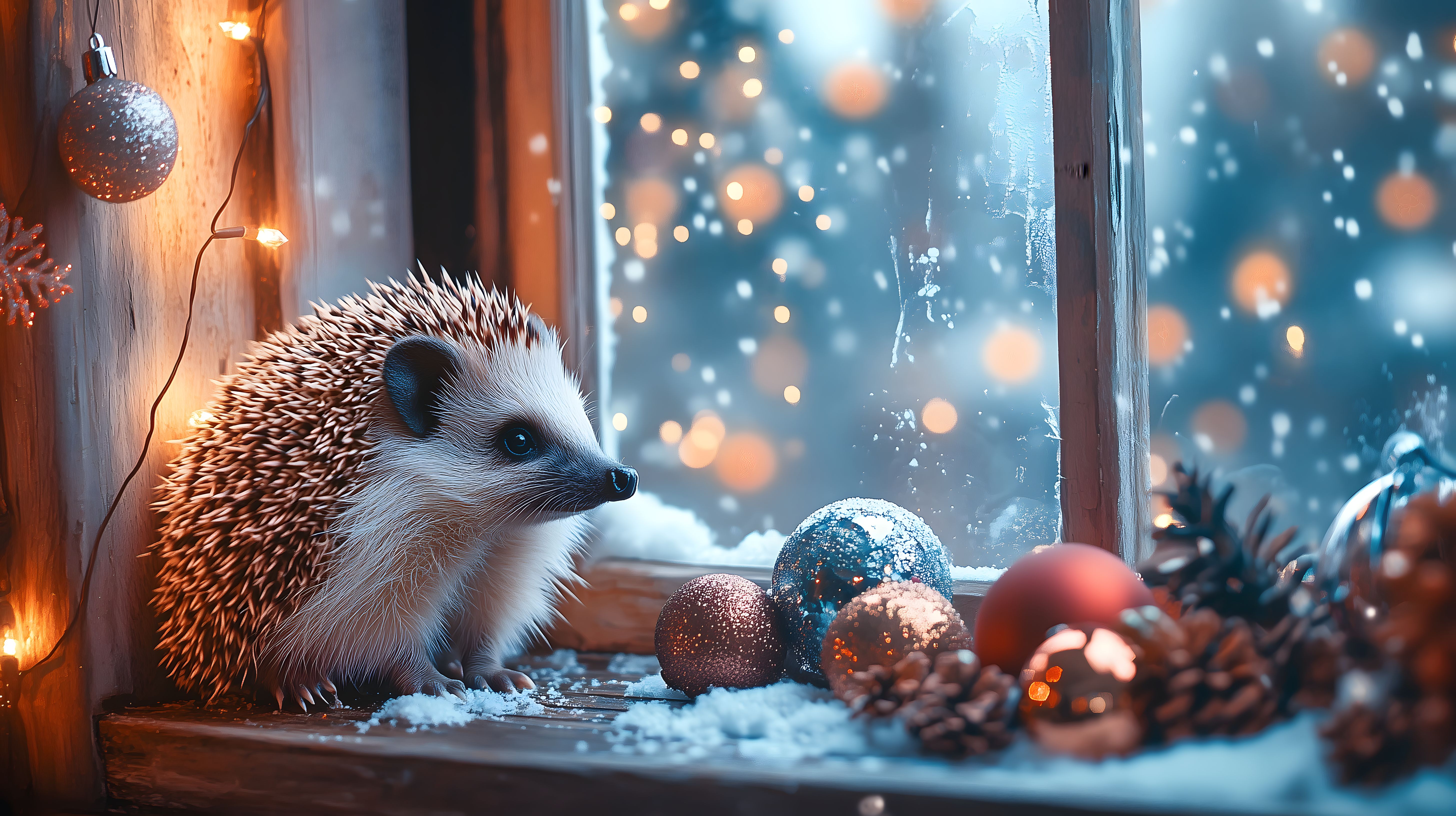 Dieses bezaubernde Foto zeigt einen süßen Igel, der sich auf einer Fensterbank in einer gemütlichen, weihnachtlichen Umgebung niedergelassen hat. Der kleine Stacheltier-Bewohner wird von funkelnden Lichterketten, Weihnachtskugeln und Tannenzapfen umrahmt, während es draußen leicht schneit. Mit seiner neugierigen Körperhaltung und dem liebevollen Blick macht der Igel einen besonders niedlichen und winterlichen Eindruck. Dieses hochauflösende Stockfoto eignet sich hervorragend für Weihnachtsdekorationen, Blogbeiträge, Newsletter und vieles mehr. Es steht unter einer Creative-Commons-Lizenz zur freien Nutzung zur Verfügung.