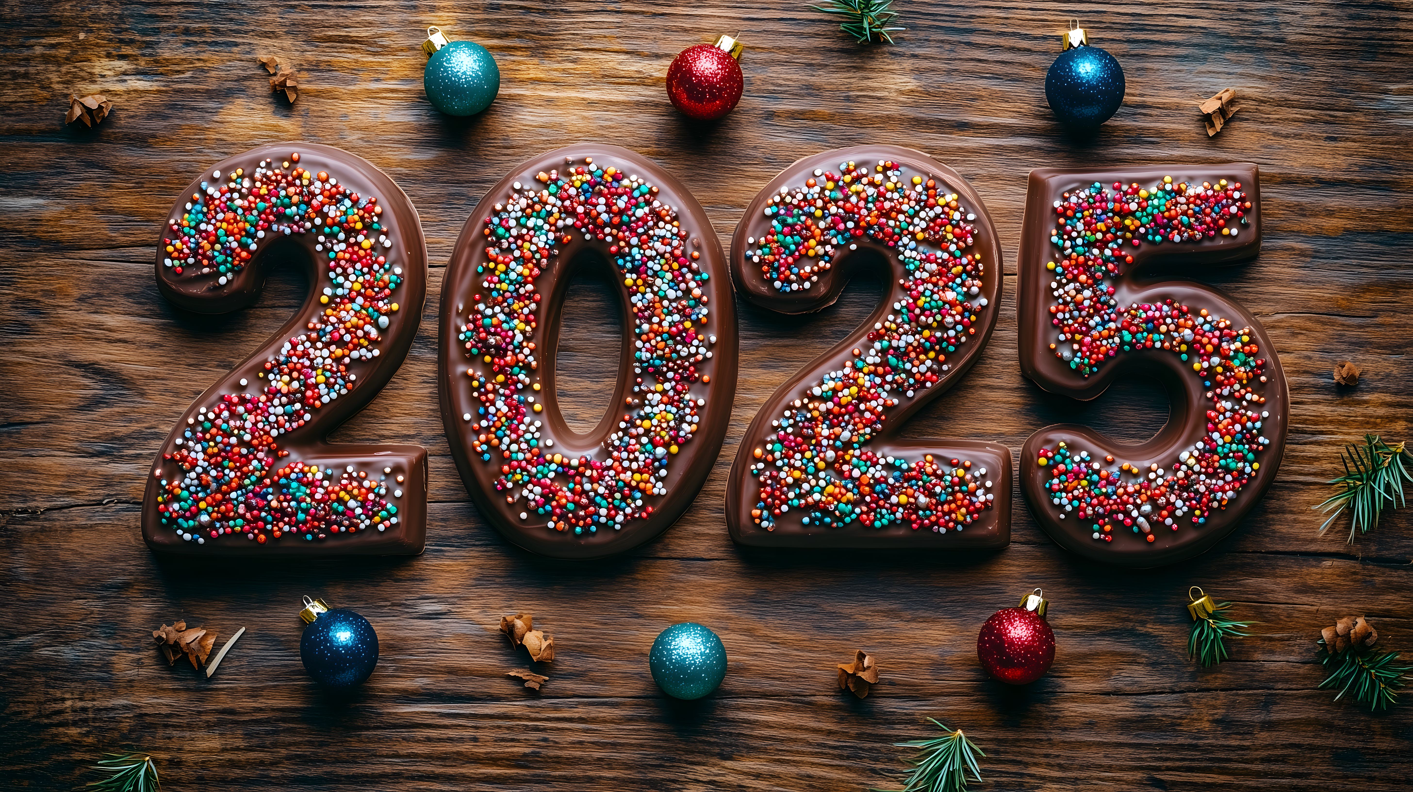 Dieses Foto zeigt eine dekorative Darstellung der Jahreszahl 2025, die aus Schokolade mit bunten Zuckerstreusel gefertigt ist. Die Zahlen liegen auf einem rustikalen Holztisch, umgeben von glänzenden Weihnachtskugeln in verschiedenen Farben. Das Bild vermittelt eine festliche und feierliche Stimmung und bietet sich als Hintergrund für Neujahrs- oder Weihnachtsgrüße an. Als kostenloses Stockfoto in hoher Auflösung unter Creative-Commons-Lizenz ist es ideal für Blogbeiträge, Newsletter, Social-Media-Posts oder Werbematerial.