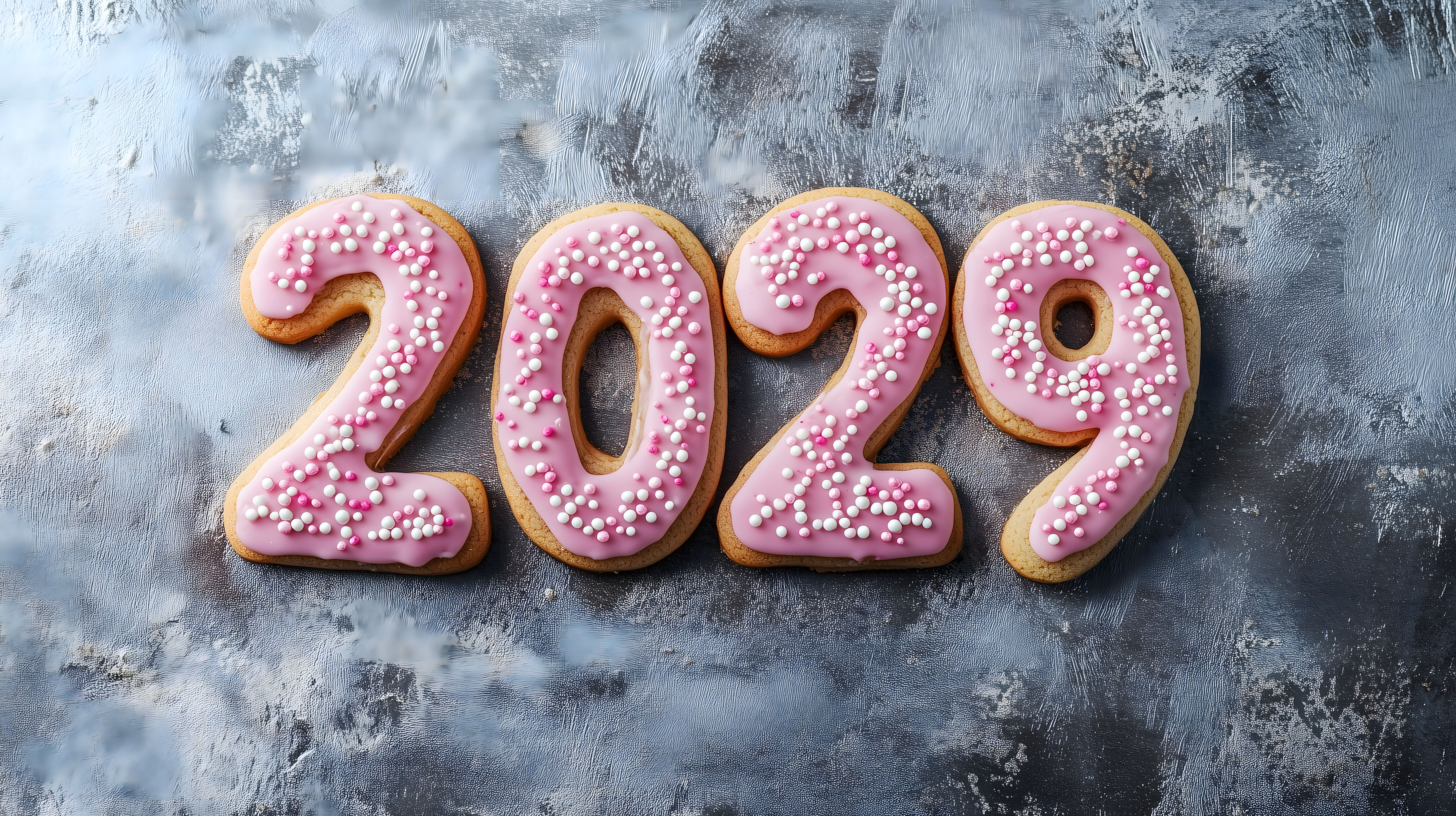 Dieses Foto zeigt vier festlich verzierte Plätzchen in Form der Jahreszahl 2029, die mit rosa Glasur und bunten Streuseln überzogen sind. Die Plätzchen liegen vor einem grauen, strukturierten Hintergrund, der eine rustikale und stimmungsvolle Atmosphäre verleiht. Dieses Stockfoto eignet sich hervorragend für Neujahrskarten, Einladungen, Blogger-Artikel oder Werbematerial rund um das Thema Silvester und Neujahrsfeierlichkeiten. Das Bild ist in hoher Auflösung verfügbar und kann unter den Bedingungen der Creative-Commons-Lizenz kostenlos genutzt werden.