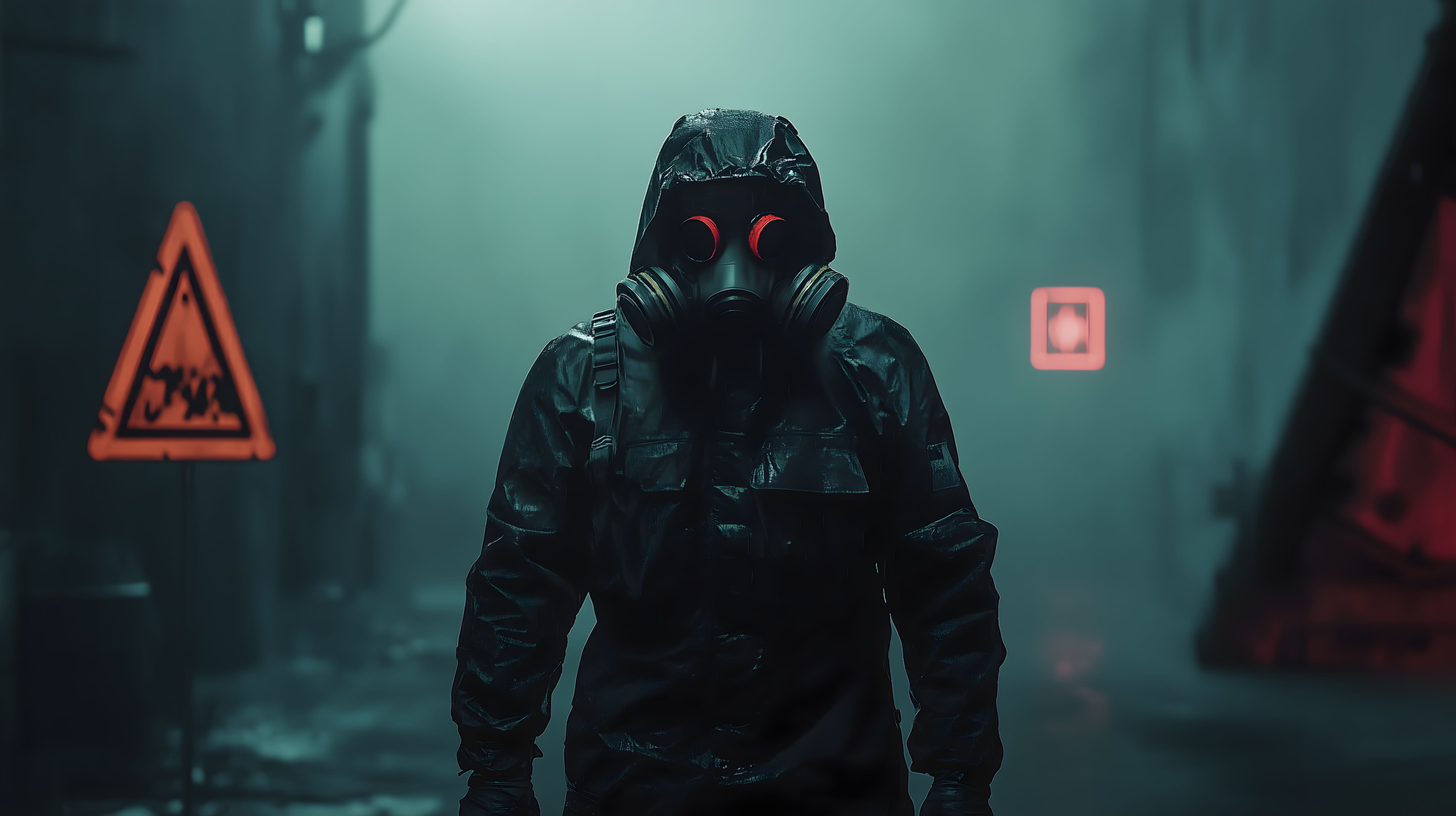 Dieses düstere Bild zeigt eine Person in schwarzer Schutzkleidung und Gasmaske, umgeben von einer nebligen, grünlich-roten Umgebung. Die dunkle, bedrohliche Stimmung vermittelt eine Endzeitatmosphäre, wie aus einem Science-Fiction-Film. Das Foto hat eine hohe Auflösung und kann unter der Creative-Commons-Lizenz kostenlos für Blogs, Newsletter, Social-Media-Posts oder Werbezwecke verwendet werden.