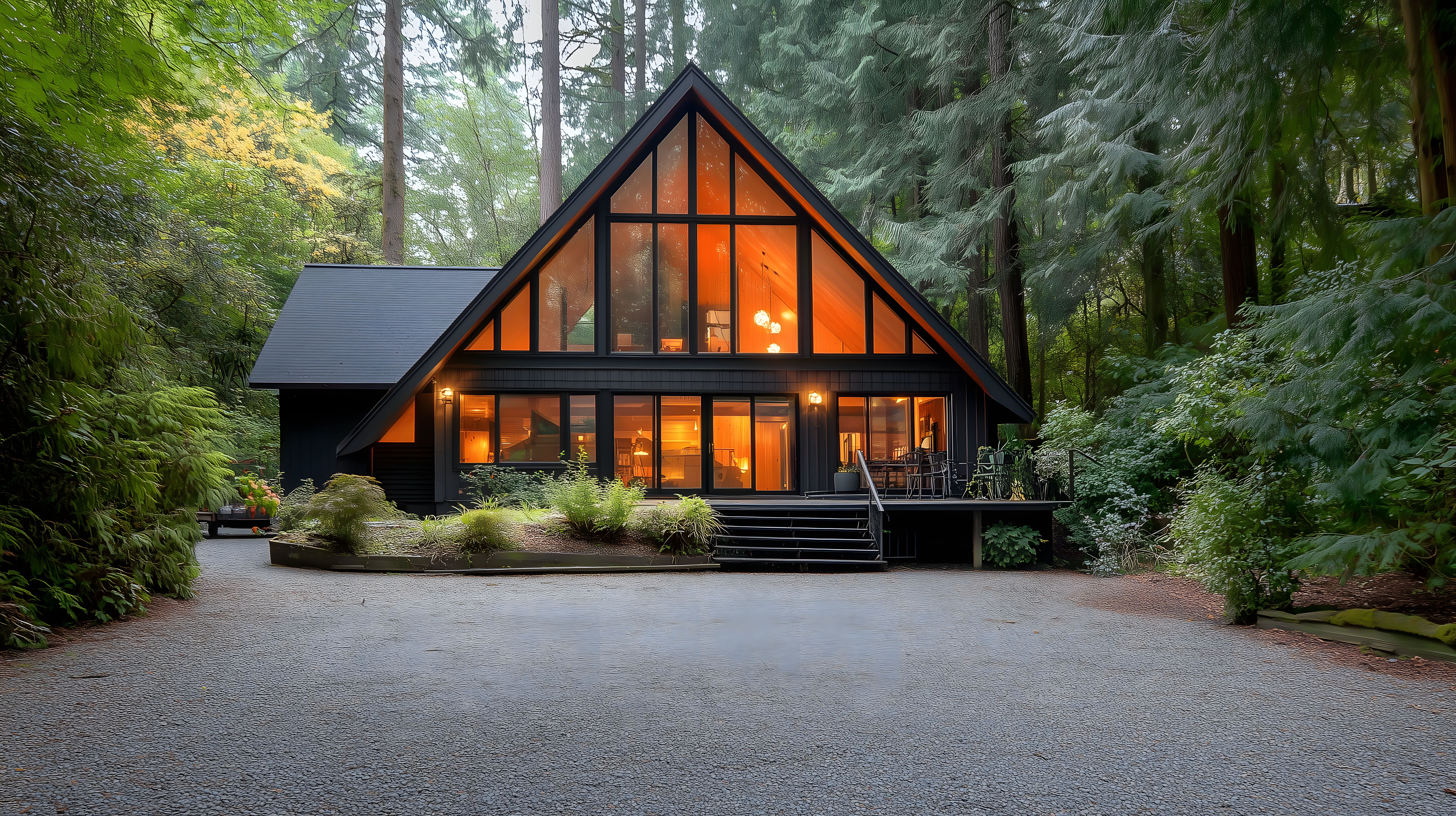 Dieses Foto zeigt eine modern gestaltete Blockhütte, die stilvoll in eine waldreiche Umgebung eingebettet ist. Die großen Glasfronten an der Vorderseite des Hauses lassen viel Licht in die Räume fallen und verbinden das Gebäude harmonisch mit der umliegenden Natur. Die dunkle Holzfassade kontrastiert schön mit dem grünen Bewuchs und verleiht der Hütte einen rustikalen, aber zugleich eleganten Charakter.