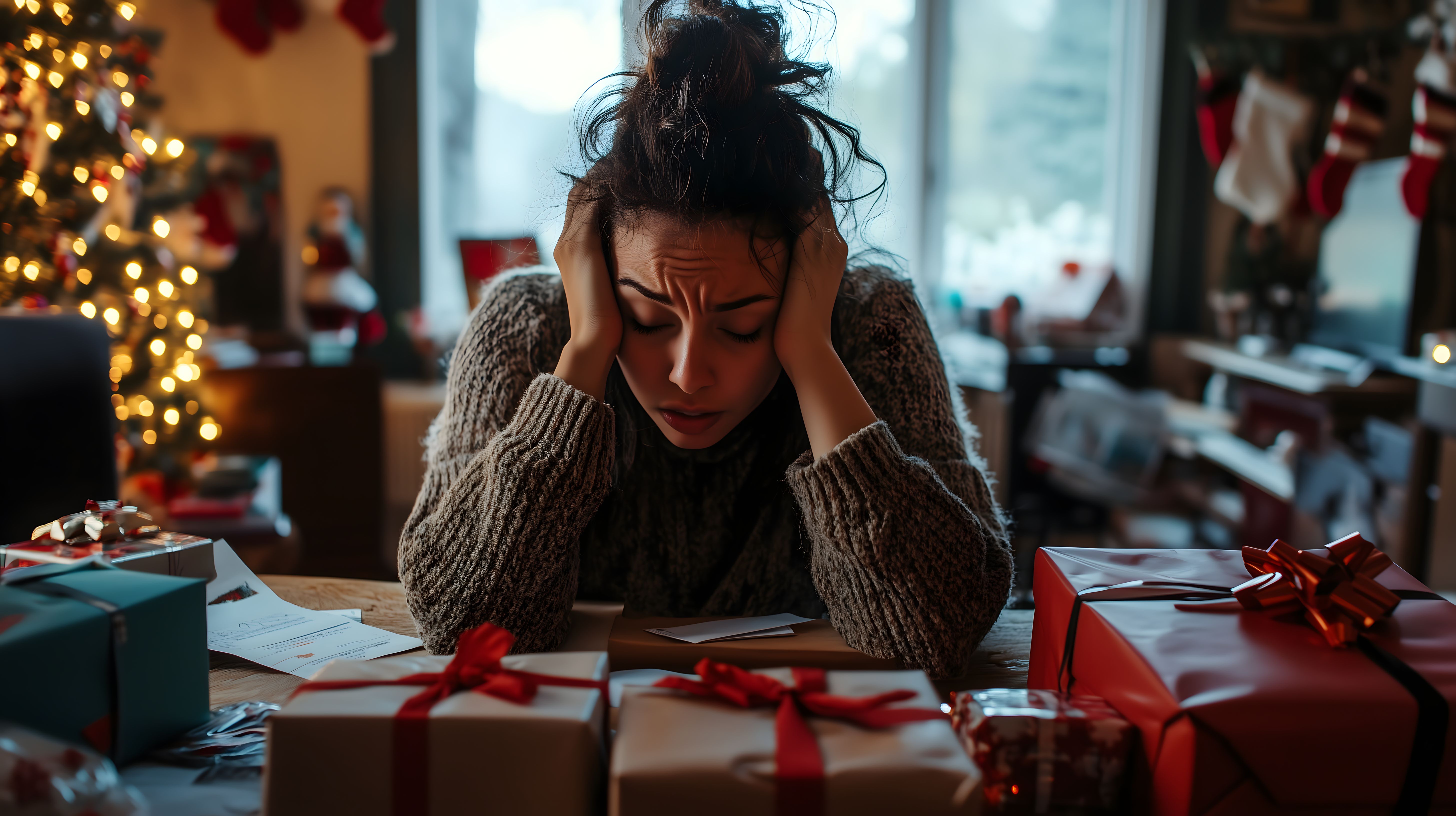 Das Bild zeigt eine gestresste junge Frau, die mit verschränkten Händen vor einem mit Geschenken übersäten Tisch sitzt. Sie scheint überfordert und in Gedanken versunken zu sein, während um sie herum eine stimmungsvolle Weihnachtsatmosphäre herrscht. Die Frau ist in einen Wollpullover gehüllt und trägt ihre Haare zu einem Dutt hochgesteckt. Vor ihr liegen verschiedene farbige Geschenkboxen mit roten Schleifen, die eine freudige Atmosphäre suggerieren. Durch das große Fenster im Hintergrund fällt gedämpftes Tageslicht in den Raum und sorgt für eine warme, gemütliche Beleuchtung.