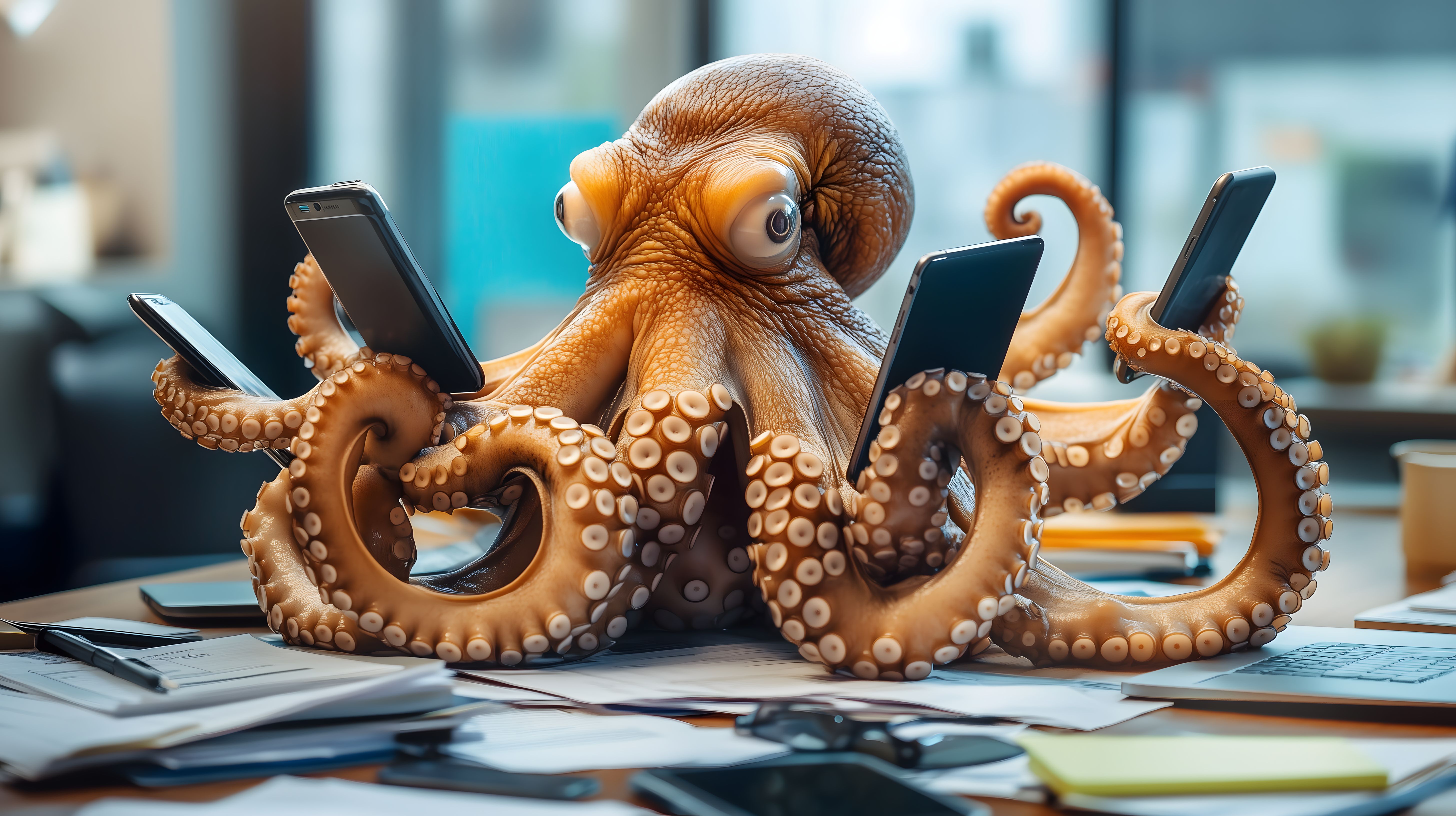 Das Bild zeigt einen Tintenfisch, der mehrere Smartphones in seinen Tentakeln hält und sie offenbar gleichzeitig bedient. Die Szene spielt in einem Büroumfeld mit Schreibutensilien und Dokumenten auf dem Tisch. Durch die ungewöhnliche Darstellung eines Tintenfischs als technisch versierte Multitasking-Kreatur entsteht ein humorvoller und surrealerer Eindruck. Dieses Stockfoto eignet sich gut für Veröffentlichungen zum Thema Digitalisierung, moderne Arbeitsweisen und Technologietrends. Mit seiner hohen Auflösung und Creative-Commons-Lizenz ist es ein vielseitig nutzbares, kostenloses Bildmaterial für Blogs, Social-Media-Beiträge, Werbekampagnen und mehr.