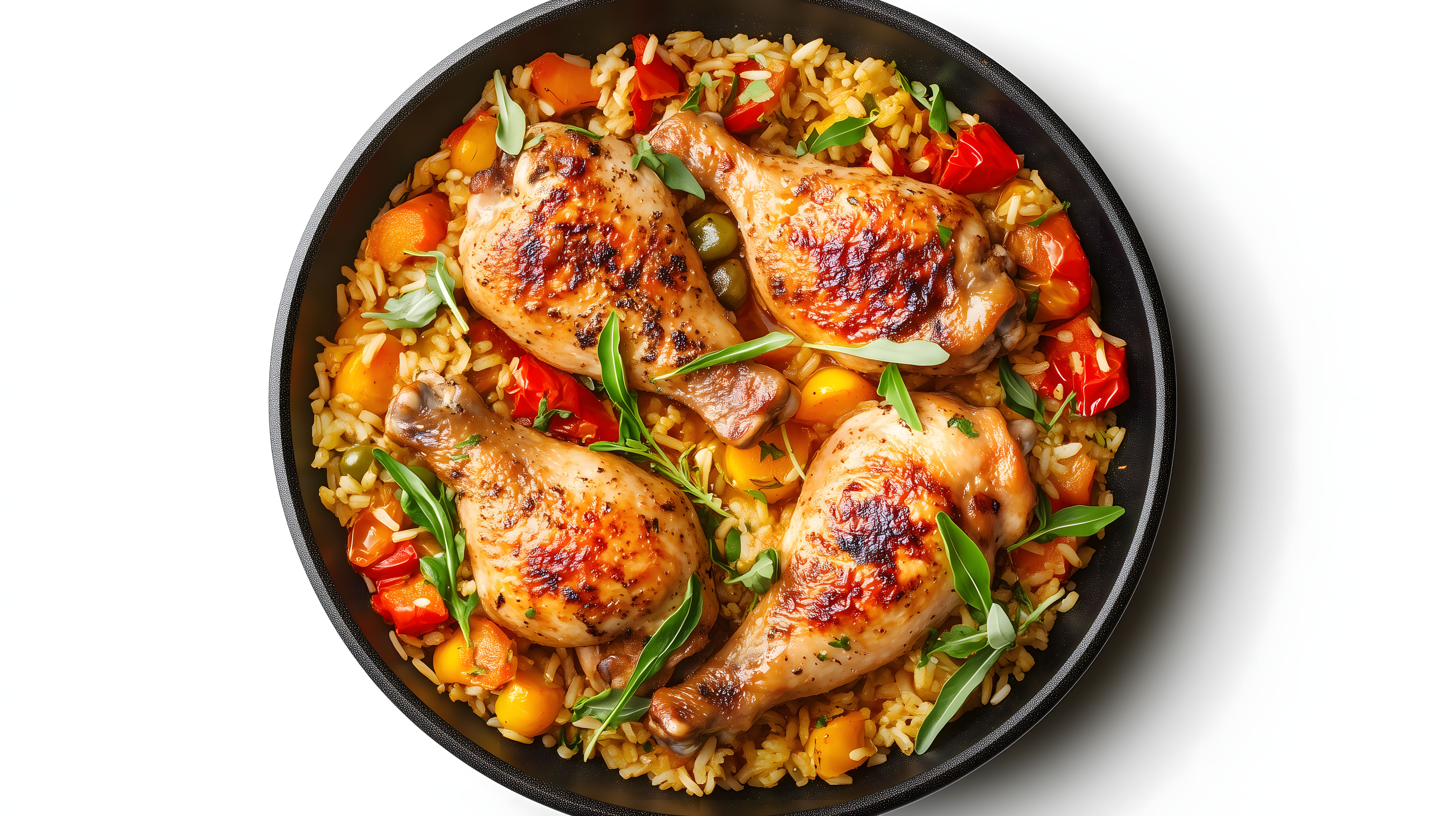 Dieses appetitliche Foto zeigt ein typisches Ofengemüse-Hähnchenrezept in einer rustikal wirkenden Pfanne. Die goldbraun gebratenen Hähnchenteile liegen auf einem Bett aus buntem Gemüsereis, der mit Paprika, Zwiebeln und Knoblauch verfeinert wurde. Die Komposition mit den farbenfrohen Zutaten und dem warmen, natürlichen Licht wirkt sehr einladend und lässt das Gericht besonders lecker erscheinen. Dieses Stockfoto eignet sich perfekt für Blogs, Newsletter oder Social-Media-Beiträge rund um köstliche, selbstgemachte Gerichte. Das hochauflösende Foto steht unter einer Creative-Commons-Lizenz zur freien Nutzung zur Verfügung.