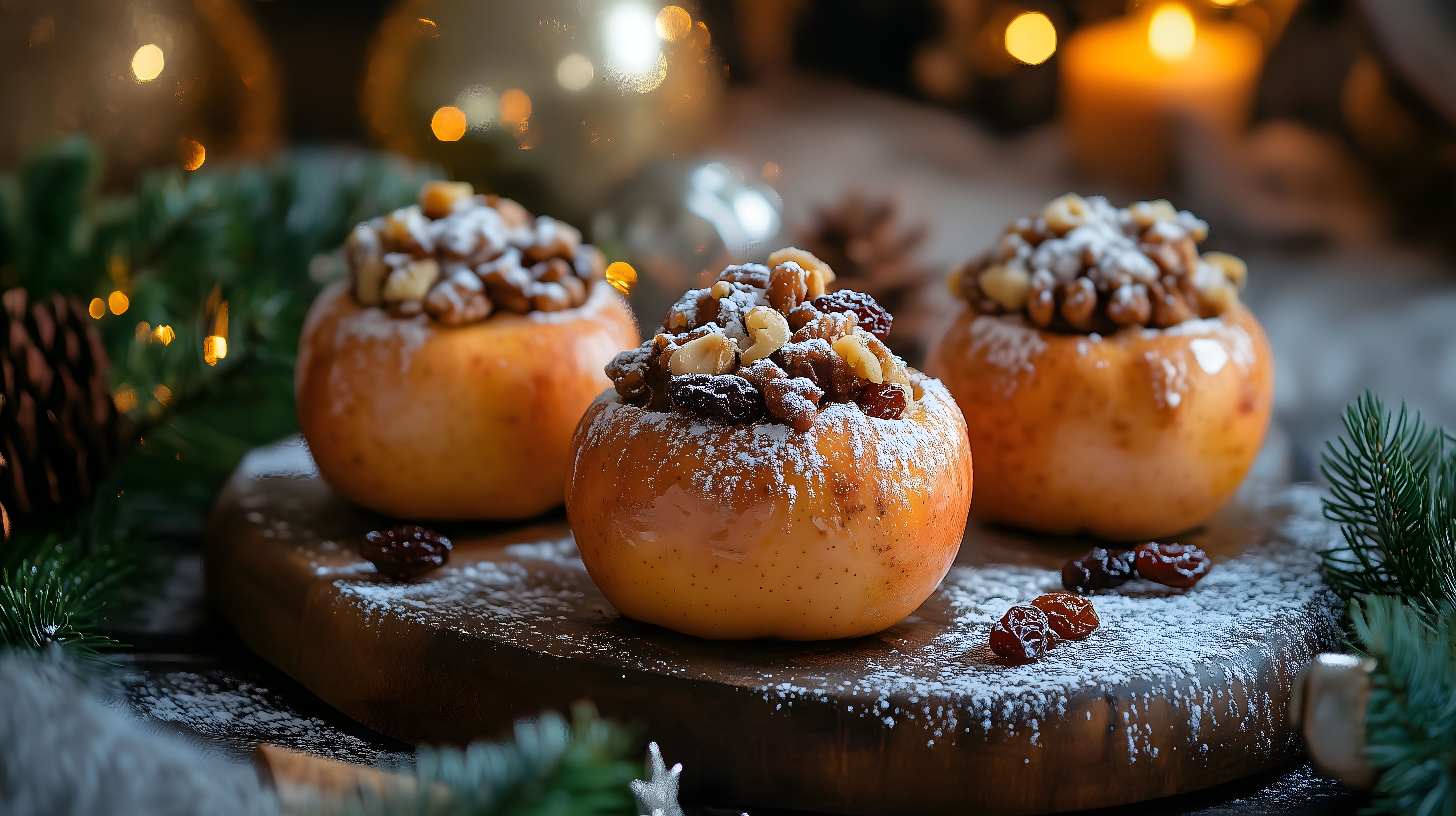 Dieses stimmungsvolle Foto zeigt drei mit Nüssen, Rosinen und Puderzucker gefüllte Bratäpfel auf einem rustikalen Holzbrett. Die Äpfel sind in einem warmen Licht vor einem Hintergrund aus Tannenzweigen und funkelnden Lichtreflexen fotografiert, was eine weihnachtliche Atmosphäre schafft. Das Bild eignet sich hervorragend für die Verwendung in Blogs, Newslettern, Social-Media-Beiträgen oder Werbematerialien rund um die Weihnachtszeit und das Winterhalbjahr. Als kostenloses Stockfoto in hoher Auflösung und unter Creative-Commons-Lizenz ist es vielseitig einsetzbar.