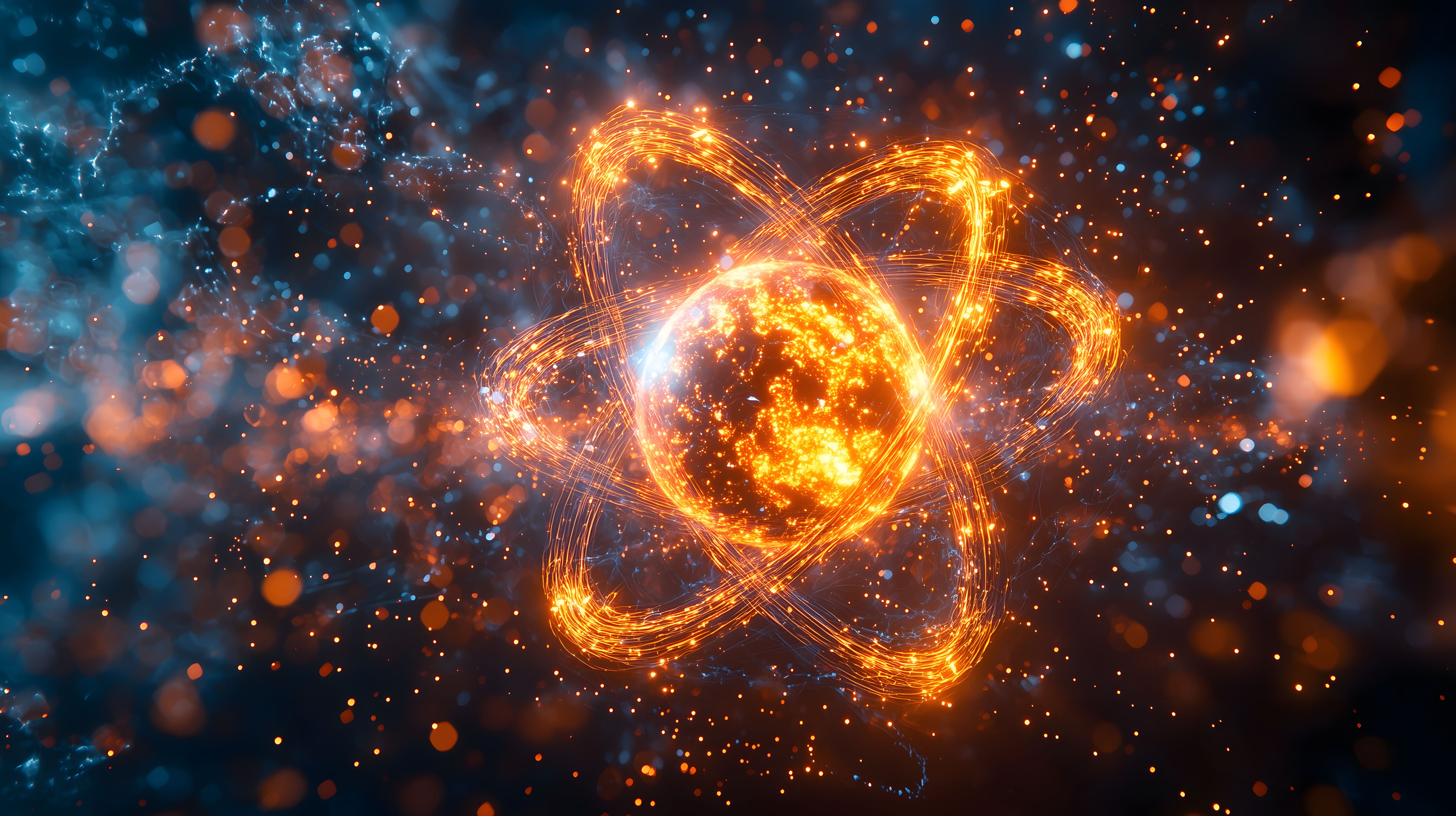Dieses Stockfoto zeigt ein energiereiches Atommodell vor einem kosmischen Hintergrund. Das Bild präsentiert einen leuchtenden, strahlenden Atomkern mit dynamischen Energielinien, die sich in einem tiefen, dunklen Weltraumhintergrund entfalten. Die Farbgebung ist stark kontrastreich mit dominanten Orangetönen, die den Energiefluss und die Strahlungskraft des Atoms betonen. Das Foto wirkt futuristisch und wissenschaftlich, eignet sich gut für Verwendungen in Präsentationen, Publikationen oder Werbematerialien rund um Themen aus Physik, Technologie oder Forschung. Als hochwertiges Stockfoto in hoher Auflösung ist es zudem kostenfrei unter einer Creative-Commons-Lizenz verfügbar.