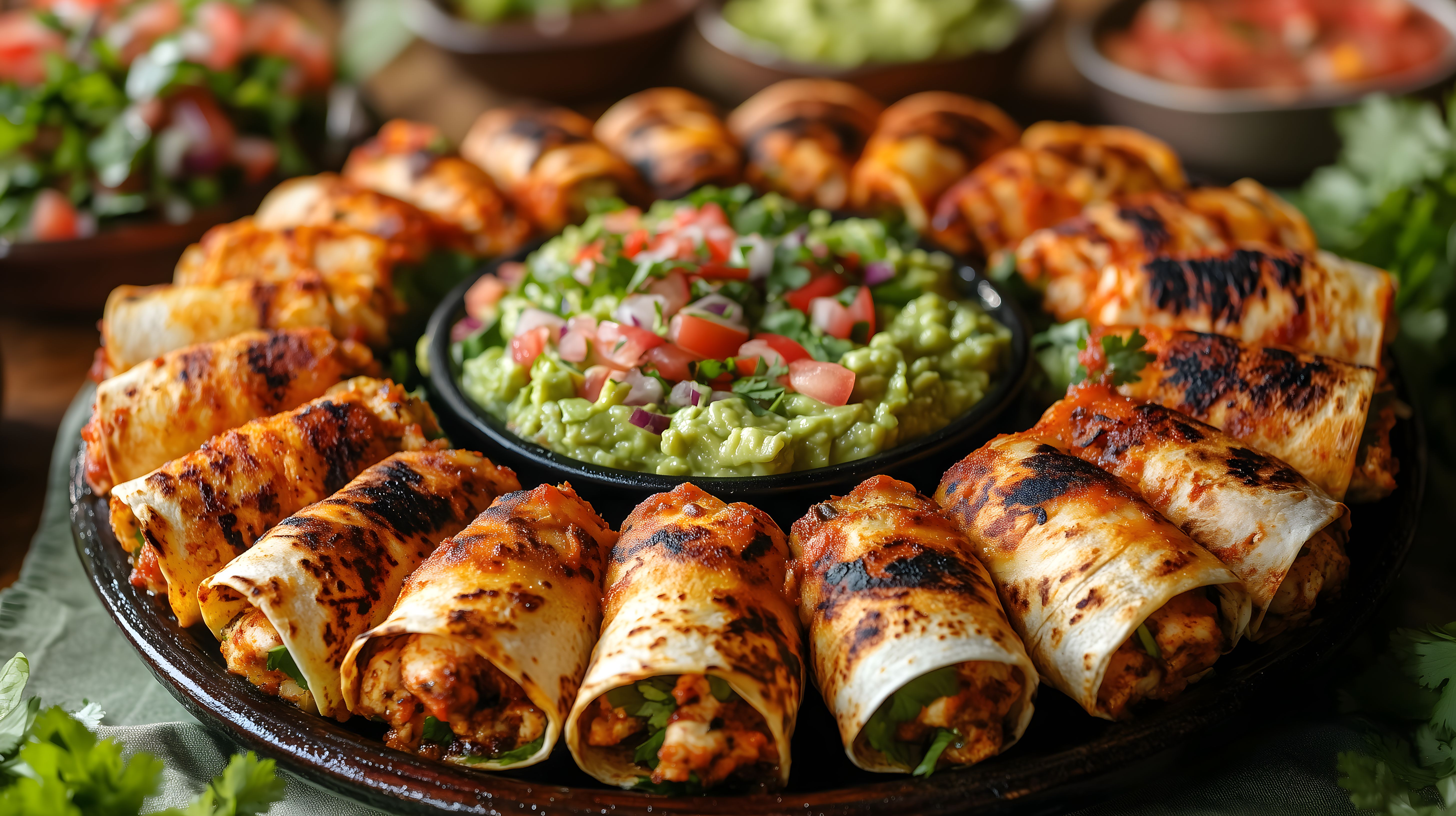 Dieses Foto zeigt eine Auswahl an leckeren Quesadillas, die mit einer schmackhaften Hühnchenfüllung gefüllt sind und von einer frischen Guacamole und einem knackigen Tomatensalat umgeben sind. Die Quesadillas wurden auf einem rustikalen Teller angerichtet, der den mexikanischen Stil wunderbar unterstreicht. Die goldbraun gegrillten Tortillas kontrastieren schön mit den grünen und roten Farbtönen der Beilagen. Dieses Foto eignet sich hervorragend für den Einsatz in Blogs, Newslettern oder Social-Media-Kanälen rund um das Thema Tex-Mex-Küche, Partyfood oder leckere Snackideen. Als kostenloses Stockfoto in hoher Auflösung und unter Creative-Commons-Lizenz ist es für vielfältige Anwendungen geeignet.