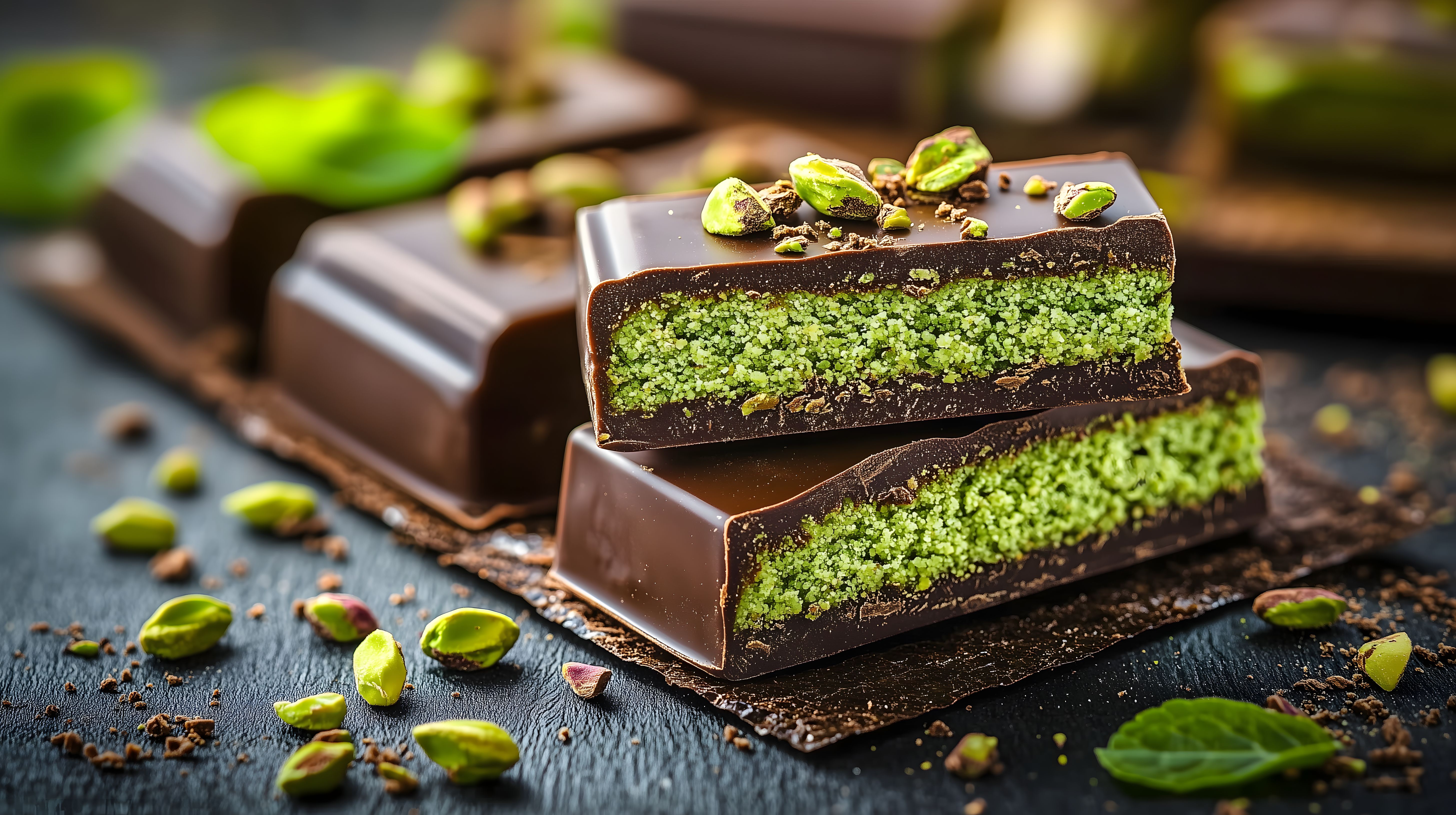 Das Bild zeigt einen Stapel von hochwertiger Pistazien-Schokolade mit einer dunklen, glänzenden Oberfläche. Die Schokolade ist mit zerbrochenen, gerösteten Pistazien und Nüssen garniert, was dem Bild eine delikate und luxuriöse Anmutung verleiht. Die Komposition und Farbgebung sind sehr stimmungsvoll und laden zum Genießen ein. Dieses Stockfoto in hoher Auflösung kann ideal für Beiträge in Blogs, Newslettern oder Social-Media-Posts rund um das Thema Feinkost, Premium-Lebensmittel oder kreative Kulinarik verwendet werden. Es steht unter einer Creative-Commons-Lizenz zur Verfügung.