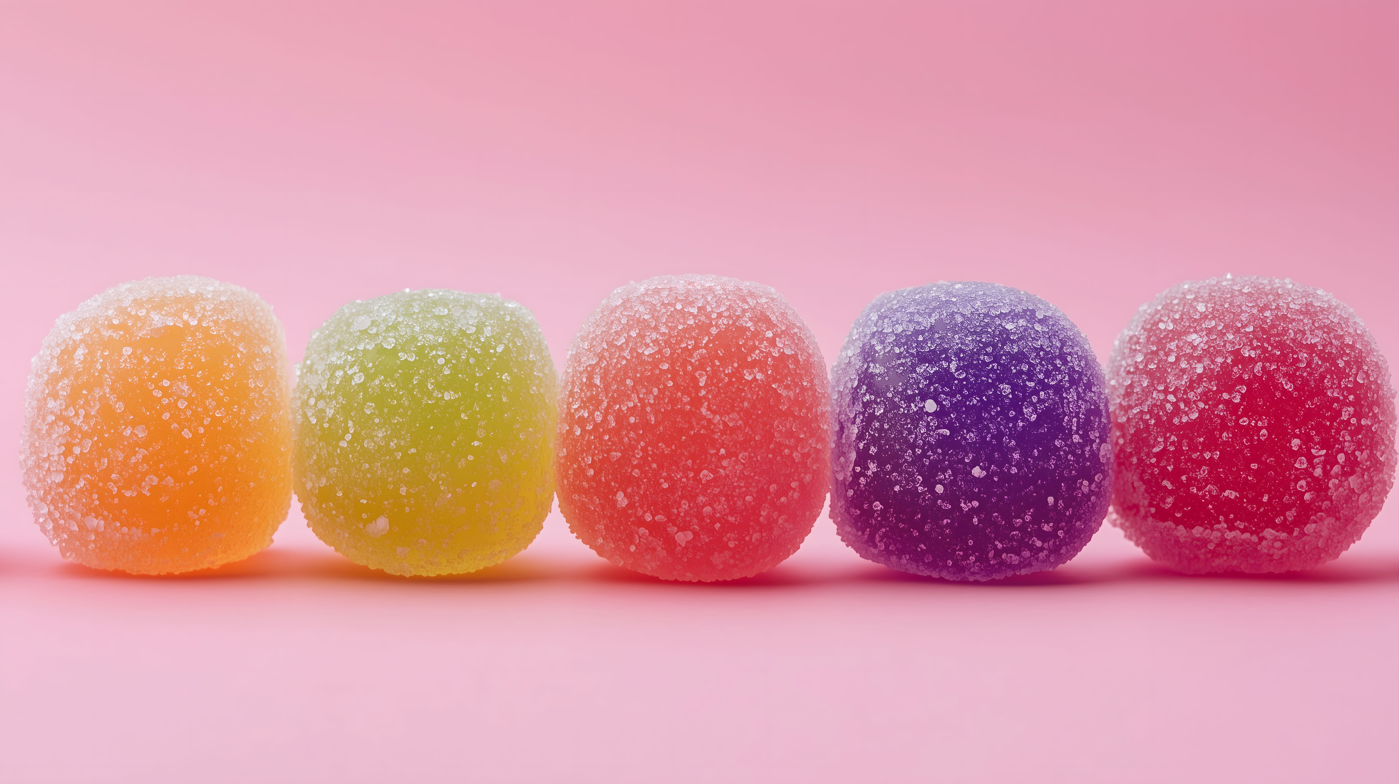 Dieses ansprechende Foto zeigt eine Reihe von bunten Gummibärchen vor einem rosa Hintergrund. Die fünf Bonbons in den Farben Orange, Gelb, Rot, Lila und Pink sind mit glitzernden Kristallen überzogen, was ihnen einen verführerischen, appetitlichen Ausdruck verleiht. Die Anordnung der Süßigkeiten in Reih und Glied betont ihre Symmetrie und visuelle Harmonie. Dieses Stockfoto eignet sich hervorragend für den Einsatz in Werbeanzeigen, Blogbeiträgen, Newslettern oder sozialen Medien, die ein fröhliches, farbenfrohes Flair vermitteln möchten. Das Bild ist in hoher Auflösung verfügbar und unter einer kostenlosen Creative-Commons-Lizenz nutzbar.
