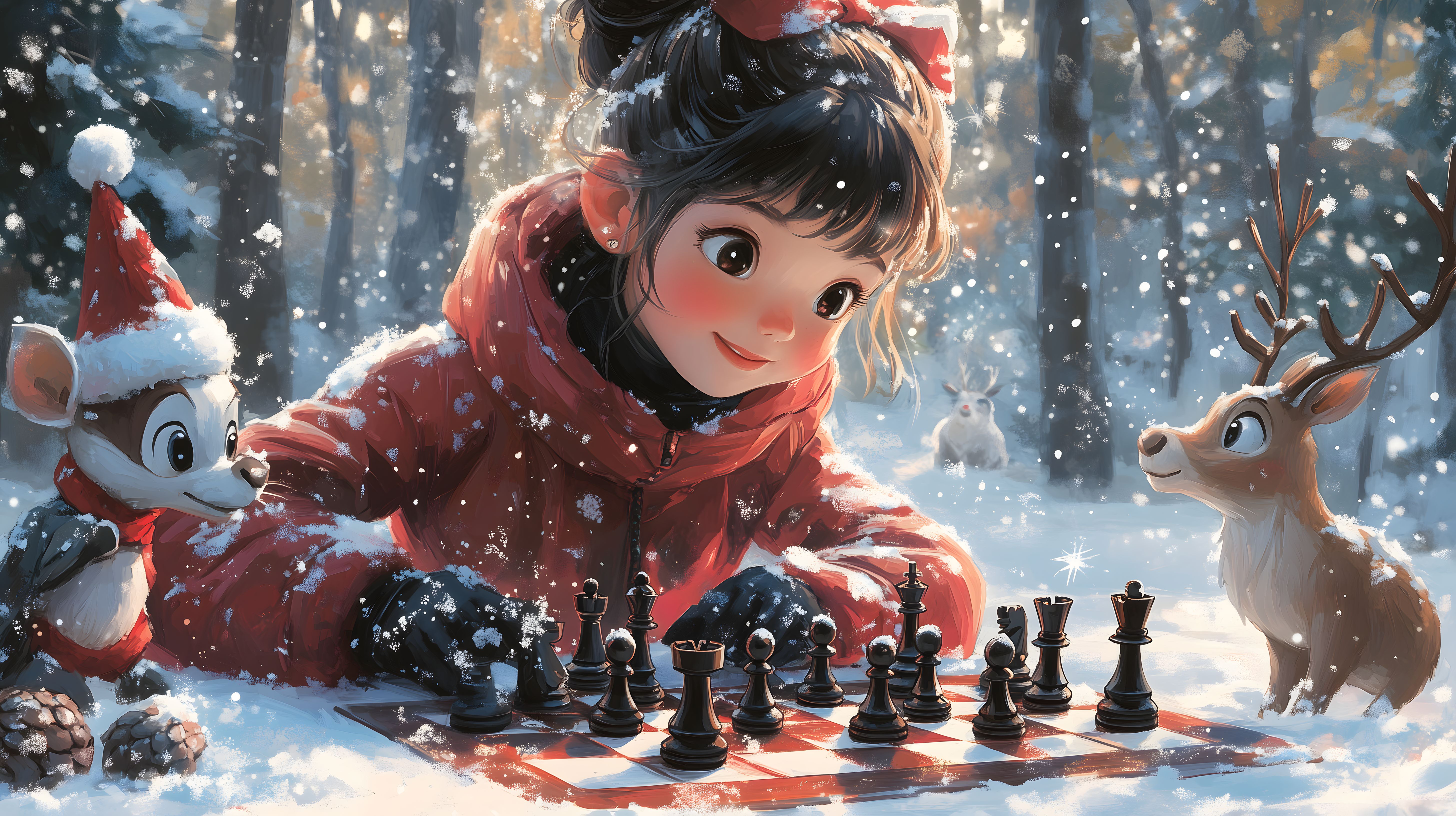 Dieses zauberhafte Winterbild zeigt ein Mädchen in rotem Mantel, das inmitten einer schneebedeckten Waldlandschaft Schach spielt. Umgeben von putzigen Tieren wie einem Hirsch und einem Eichhörnchen, entfaltet sich eine märchenhafte Szenerie voller Fantasie und Winterstimmung. Das hochwertige Stockfoto eignet sich hervorragend für Verwendungen in Blogs, Newslettern, Social-Media-Posts oder Werbematerialien, die eine besinnliche, winterliche Atmosphäre transportieren möchten. Aufgenommen in hoher Auflösung und unter der Creative-Commons-Lizenz verfügbar, lässt sich dieses Bild flexibel und kostenfrei einsetzen.