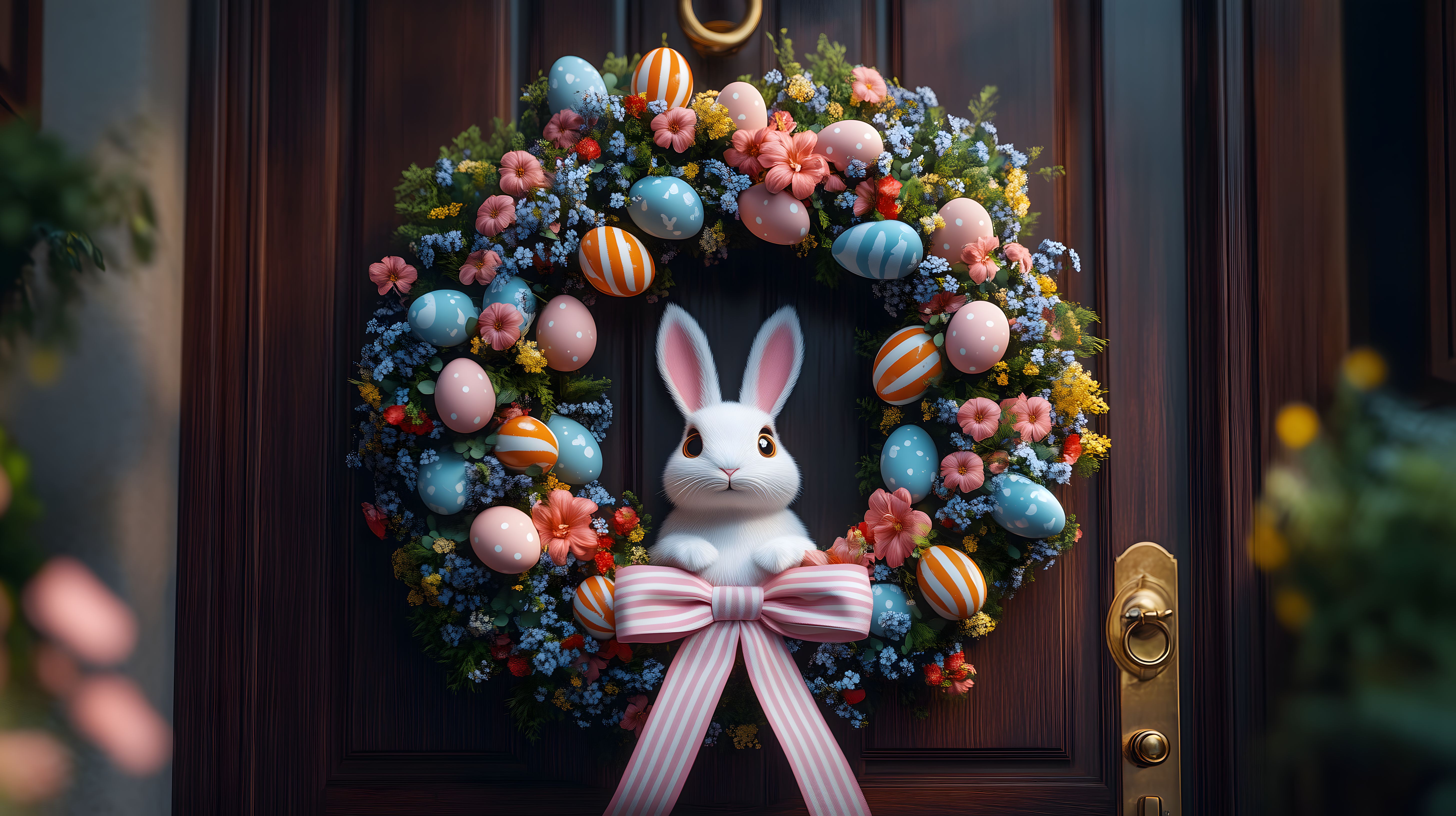 Dieses prächtige Foto zeigt einen wunderschönen Osterkranz, der an einer Holztür angebracht ist. Der Kranz ist üppig mit bunten Blumen und Ostereiern in verschiedenen Farben dekoriert. Ein niedlicher weißer Hase mit langen Ohren ist im Zentrum des Kranzes platziert und verleiht der Szene einen charmanten, festlichen Touch. Die Kombination aus den frischen Blüten, den bunten Eiern und dem Osterhasen erschafft eine fröhliche, frühlinghafte Atmosphäre. Dieses hochauflösende Stockfoto in hoher Qualität eignet sich hervorragend für Verwendungen in Blogs, Newslettern, Social-Media-Posts oder Werbematerialien rund um Ostern, Frühling und Feiertage. Die Lizenz erlaubt eine kostenlose Nutzung unter Creative-Commons-Bedingungen.