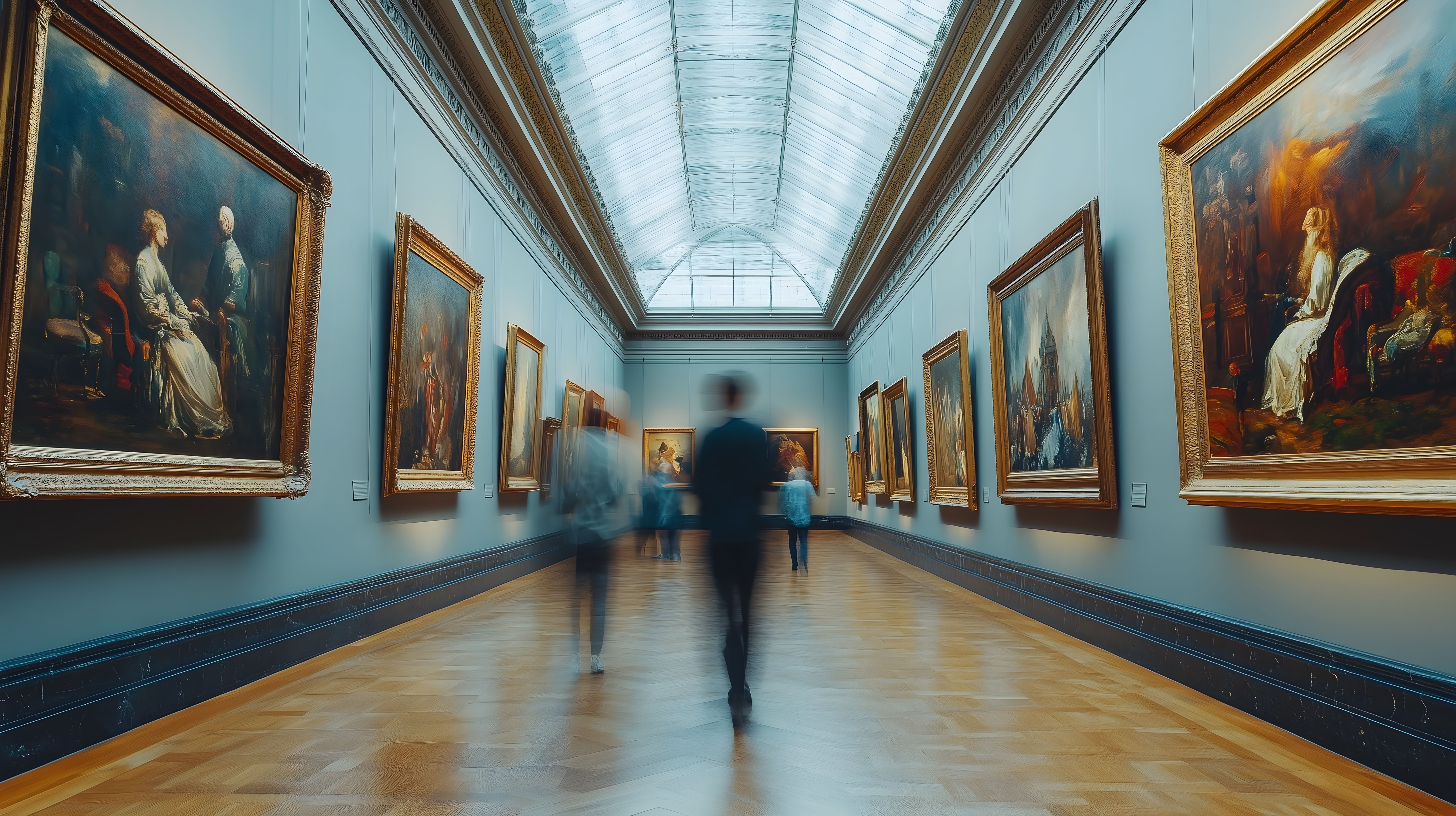 Das Foto zeigt einen prachtvollen, weitläufigen Ausstellungsraum in einem Kunstmuseum oder einer Gemäldegalerie. Der Raum ist mit hohen Decken und einem imposanten Glasdach ausgestattet, das natürliches Licht in den Saal lässt. An den Wänden hängen zahlreiche goldgerahmte Ölgemälde, die eine beeindruckende Kunstsammlung zeigen. Besucher laufen in einer ruhigen Pose durch den Saal, um die Werke zu betrachten. Das Foto vermittelt eine Atmosphäre von Ruhe, Eleganz und Hochkultur. Es eignet sich hervorragend als kostenloses Stockfoto für Blogbeiträge, Werbung oder Social-Media-Kanäle rund um Kunst, Kultur und den Museumsbesuch.