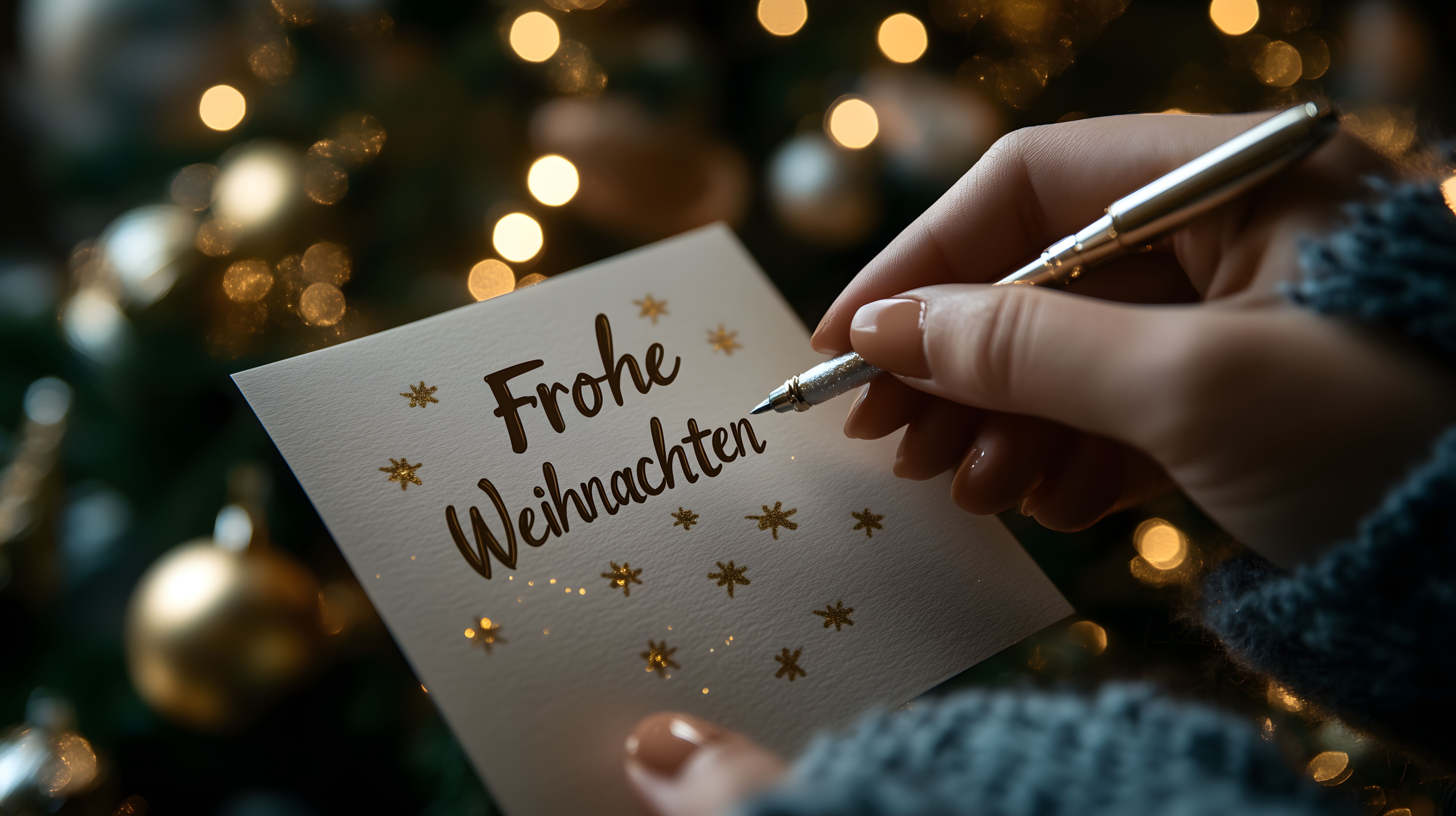 Das Bild zeigt eine festliche Weihnachtskarte mit der handgeschriebenen Aufschrift 'Frohe Weihnachten' in goldener Kalligrafie. Der Hintergrund ist mit glitzernden Sternen und Bokeh-Effekten in warmen Goldtönen dekoriert, was eine stimmungsvolle, elegante Atmosphäre erzeugt. Das Foto eignet sich perfekt für Weihnachtsdekorationen, Grußkarten, Einladungen und Werbematerialien rund um die Feiertage. Dieses hochauflösende Stockfoto ist unter einer Creative-Commons-Lizenz frei verwendbar.