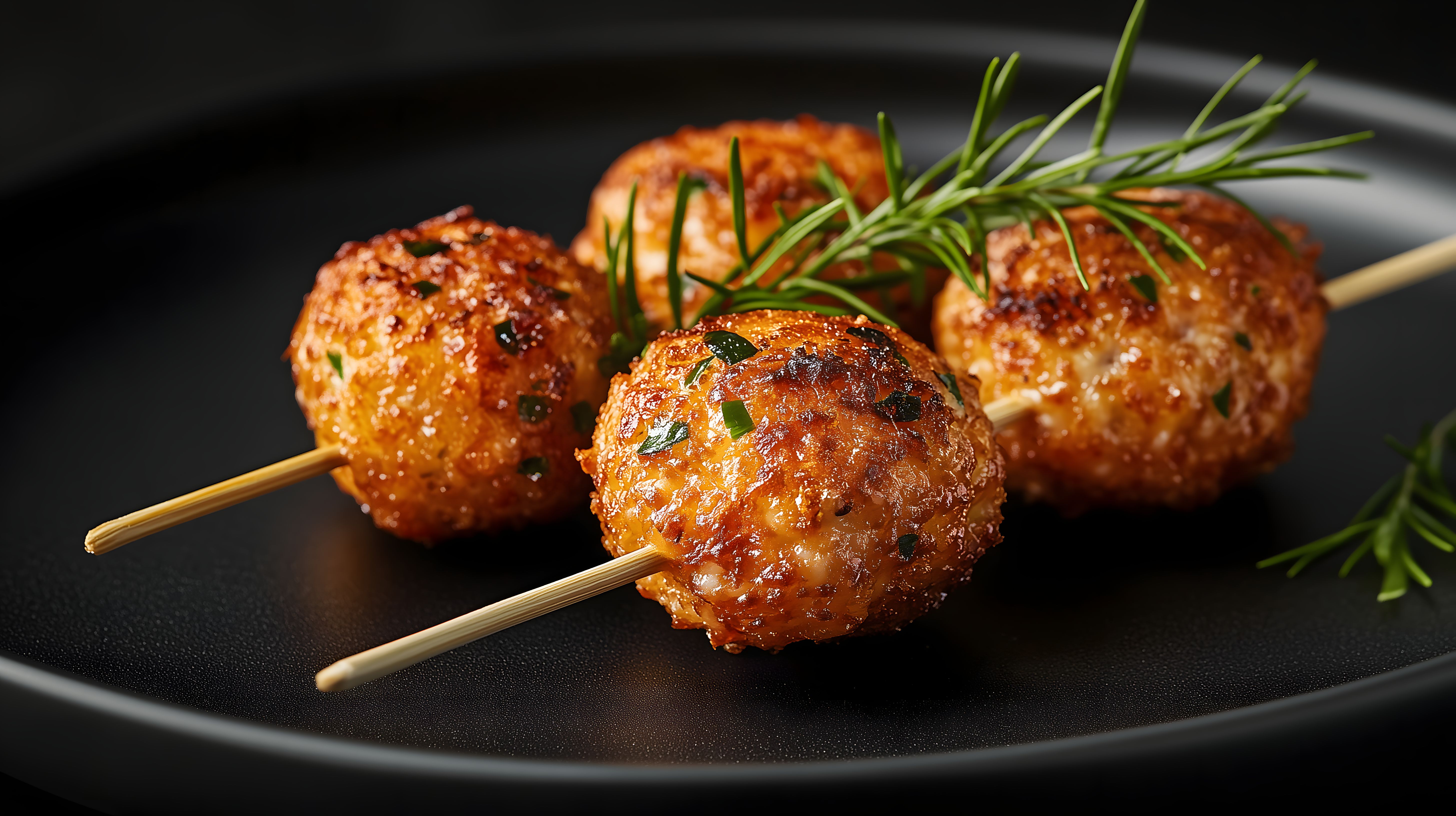 Dieses Foto zeigt saftige, frisch zubereitete Hackbällchen, die dekorativ auf einem schwarzen Teller mit frisch geschnittenen Rosmarin-Zweigen angerichtet sind. Die würzigen Bällchen haben eine schöne, kross gebratene Oberfläche und stehen im Kontrast zum dunklen Hintergrund. Dieses Stockfoto in hoher Auflösung eignet sich hervorragend für die Verwendung in Blogs, Newslettern, Social-Media-Beiträgen oder Werbematerialien rund um das Thema Kochen, Gastronomie oder Catering. Das Bild steht unter einer Creative-Commons-Lizenz zur freien Nutzung zur Verfügung.