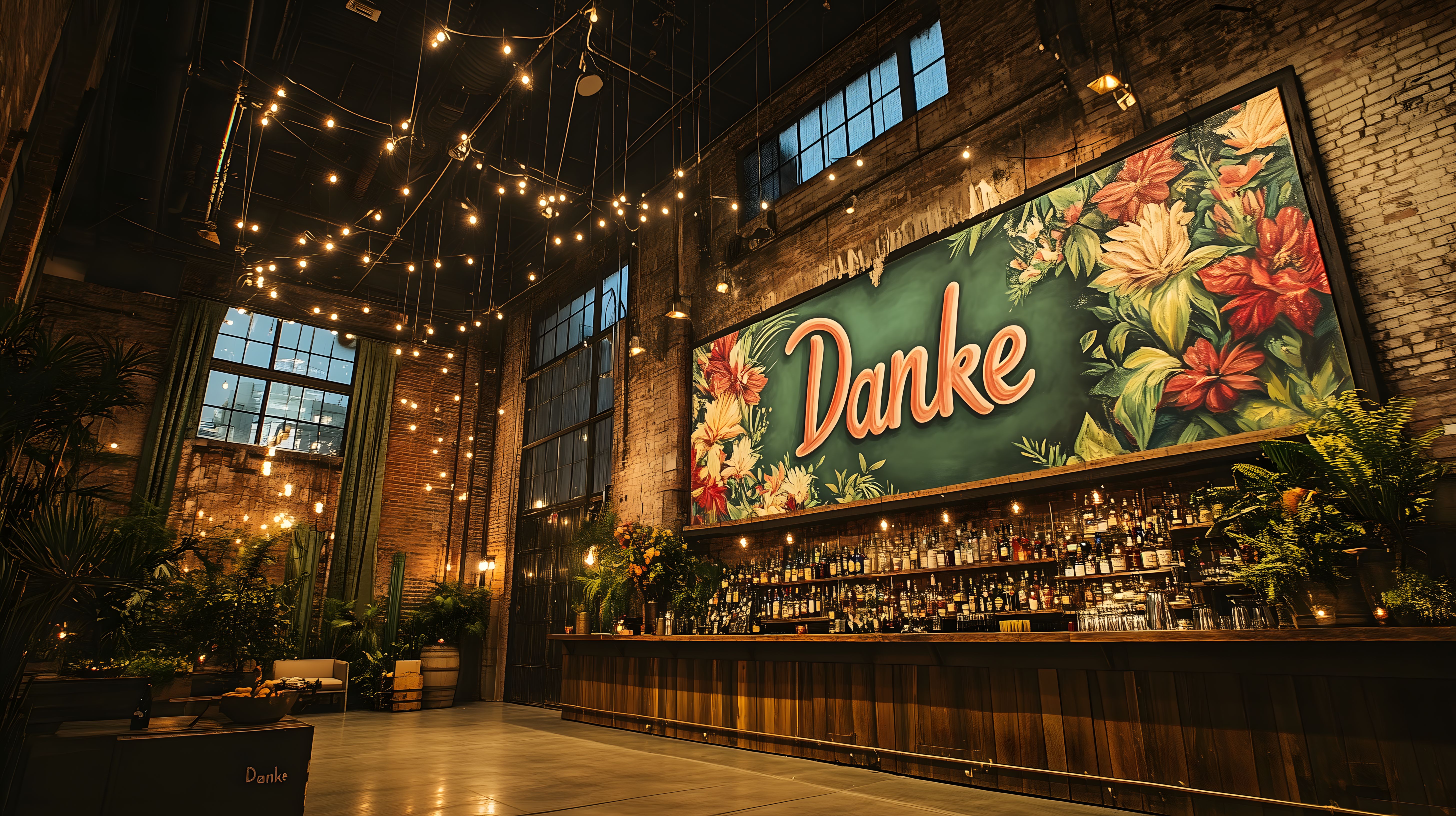 Dieses Foto zeigt eine stimmungsvolle Cocktailbar mit rustikalem Charme. Der Blickfang ist ein großes Wandgemälde mit bunten, tropischen Blumen, das den Hintergrund der Bar bildet. Davor erstreckt sich eine lange, hölzerne Theke, auf der verschiedene Flaschen und Gläser stehen. Eine Vielzahl von Lichterketten verleiht dem Raum eine gemütliche Atmosphäre und zaubert ein warmes, einladendes Licht. Durch die großen Fenster fällt zusätzliches Tageslicht in den Raum. Das Foto eignet sich hervorragend für den Einsatz in Blogbeiträgen, Newslettern, Werbekampagnen oder Sozialen Medien rund um das Thema Gastronomie, Cocktailkultur oder stimmungsvolles Ambiente. Dieses hochauflösende, kostenlose Stockfoto steht unter einer Creative-Commons-Lizenz zur Verfügung.