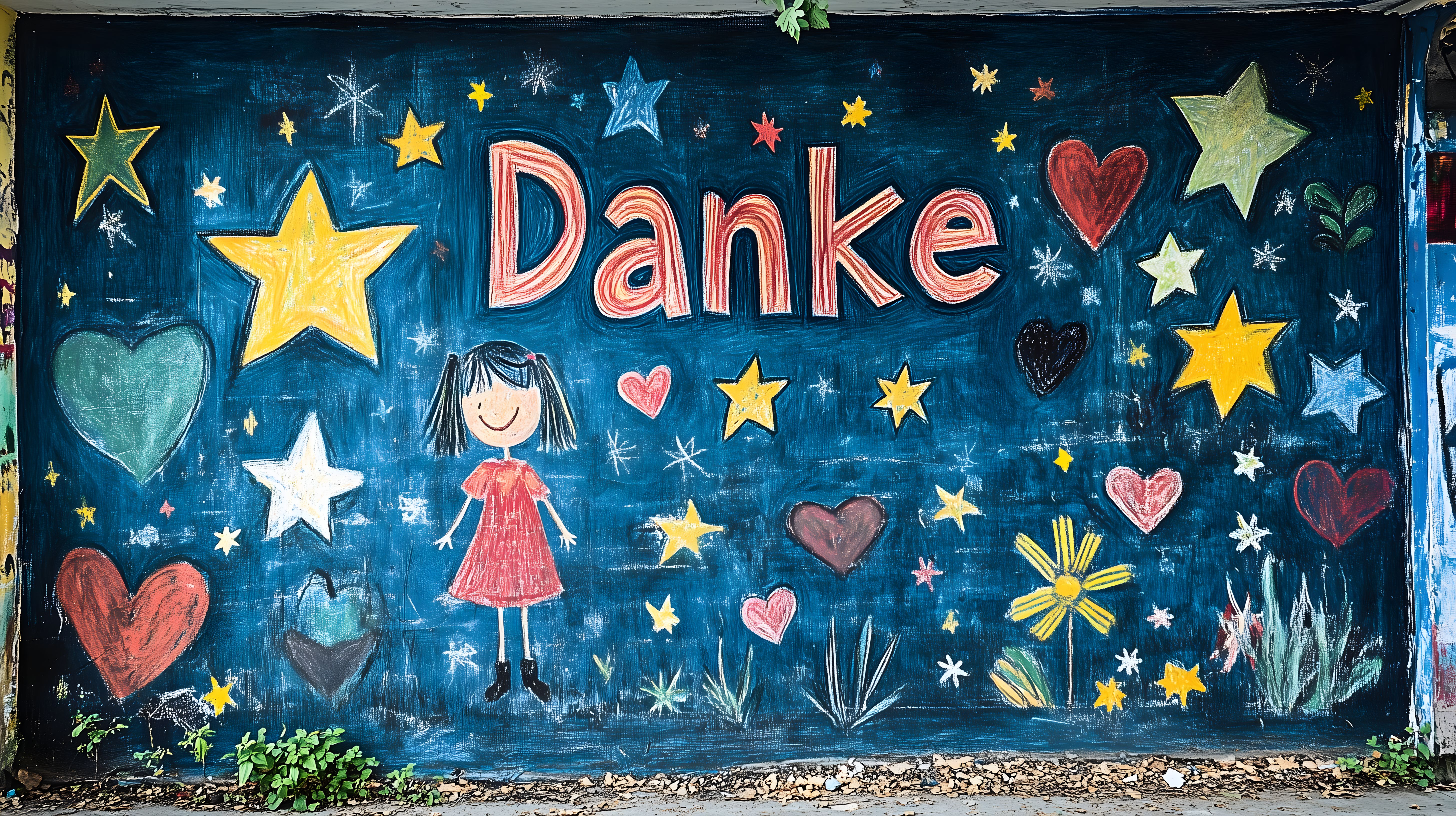 Das Bild zeigt eine bunte Kreidetafel mit der Aufschrift 'Danke' und verschiedenen Zeichnungen und Symbolen wie Sternen, Herzen und Blumen. Die Tafel ist auf einer Steinmauer befestigt und wird von einer kleinen Zeichnung eines Mädchens in einer roten Kleidung dominiert. Die Gestaltung wirkt fröhlich, kreativ und handgemacht, was sie ideal für den Einsatz in Kindergärten, Schulen oder Kinderzimmern macht. Dieses hochauflösende Stockfoto unter der Creative-Commons-Lizenz eignet sich hervorragend für Blogs, Newsletter, Social-Media-Beiträge oder Werbematerialien, in denen ein positiver, motivierender und dankbarer Ton angeschlagen werden soll.