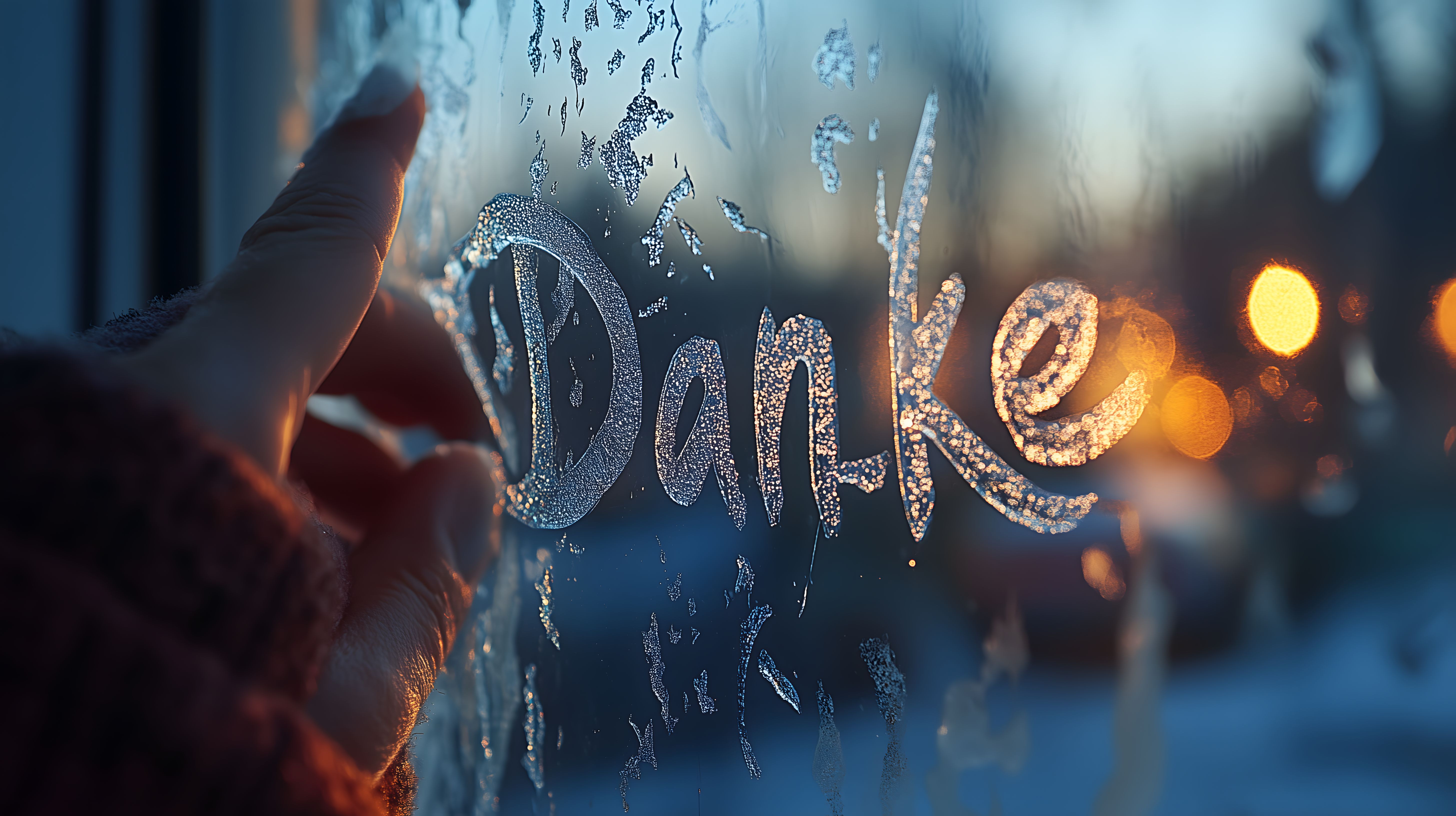 Dieses stimmungsvolle Foto zeigt eine frostige Fensterscheibe mit einem in Kristallen eingefrorenen 'Danke'-Schriftzug. Das Licht der Abendbeleuchtung erzeugt einen wärmenden, goldenen Bokeh-Effekt im Hintergrund. Die Szene vermittelt eine winterliche Dankbarkeit und eine festliche, gemütliche Stimmung. Dieses hochauflösende Stockfoto ist unter der Creative-Commons-Lizenz frei nutzbar, etwa für Blog-Beiträge, Newsletter-Designs oder winterliche Werbeanzeigen.