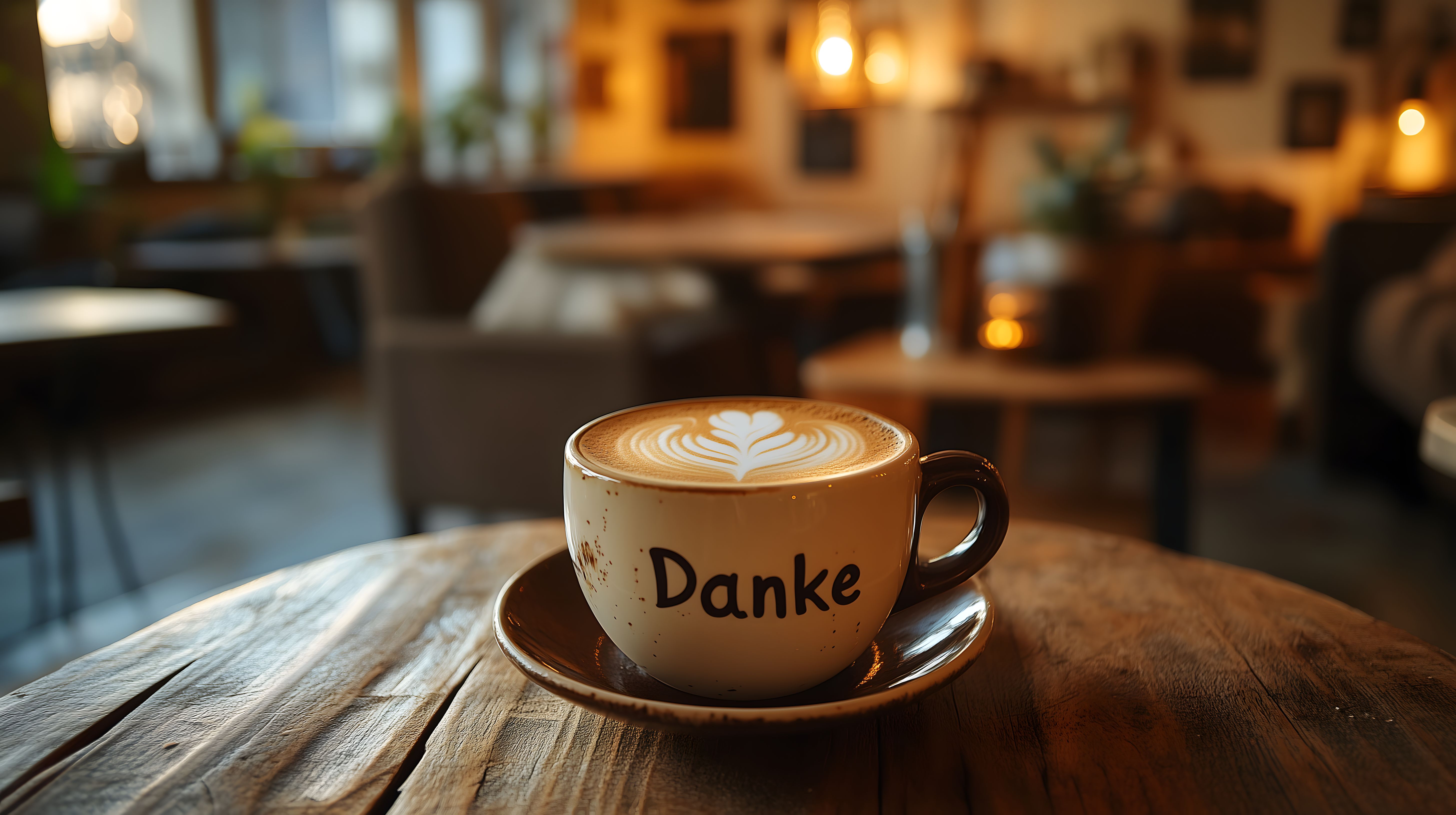Das Bild zeigt eine Kaffeetasse mit einer kunstvollen Milchschaumverzierung und der Aufschrift 'Danke' auf einem rustikalen Holztisch in einem gemütlichen Café-Ambiente. Der Kaffee ist Teil einer urigen, stimmungsvollen Szenerie mit Kerzen, Möbeln und Dekorationselementen in warmen Brauntönen. Das Foto vermittelt einen Eindruck von Gemütlichkeit, Genuss und Dankbarkeit, der sich perfekt für die Verwendung in Blogbeiträgen, Social-Media-Posts oder Werbekampagnen rund um das Thema Kaffee, Kulinarik oder Gastgewerbe eignet. Als hochwertiges, kostenloses Stockfoto unter einer Creative-Commons-Lizenz ist es frei und unbegrenzt nutzbar.