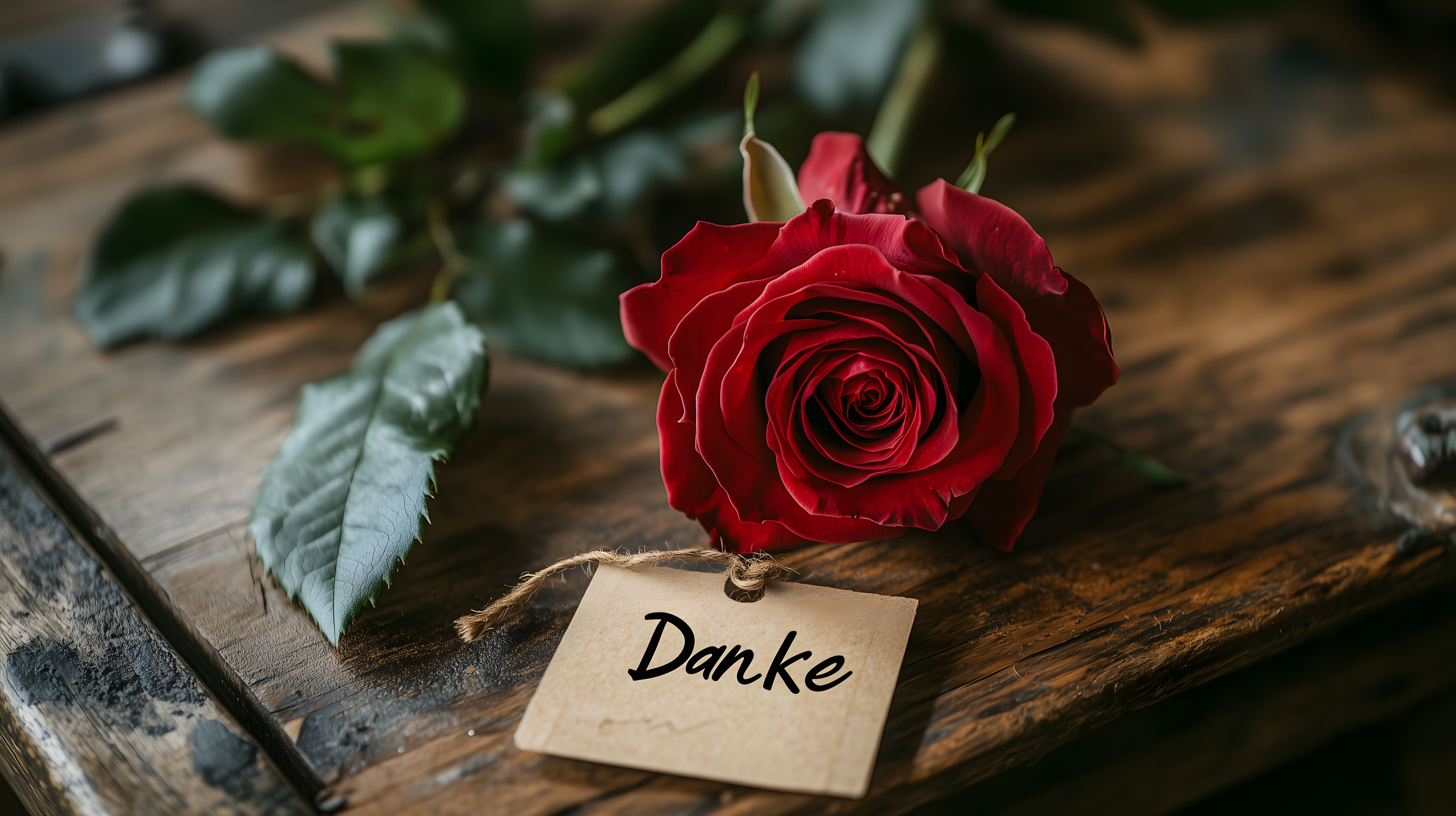 Dieses Stockfoto zeigt eine wunderschöne, dunkelrote Rose, die auf einem rustikalen Holzhintergrund platziert ist. An einem Faden hängt ein kleines Schild mit dem Wort 'Danke' darauf. Die Blüte ist detailreich und farbintensiv fotografiert, was eine elegante und romantische Stimmung erzeugt. Das Foto eignet sich hervorragend für den Einsatz in Blogs, Newslettern, Social-Media-Beiträgen oder Werbematerialien, z.B. für Grußkarten, Einladungen oder Geschenkverpackungen rund um Valentinstag, Muttertag, Hochzeiten oder andere Anlässe, bei denen Dankbarkeit und Wertschätzung im Vordergrund stehen. Das hochauflösende Bild ist unter einer Creative-Commons-Lizenz frei nutzbar.