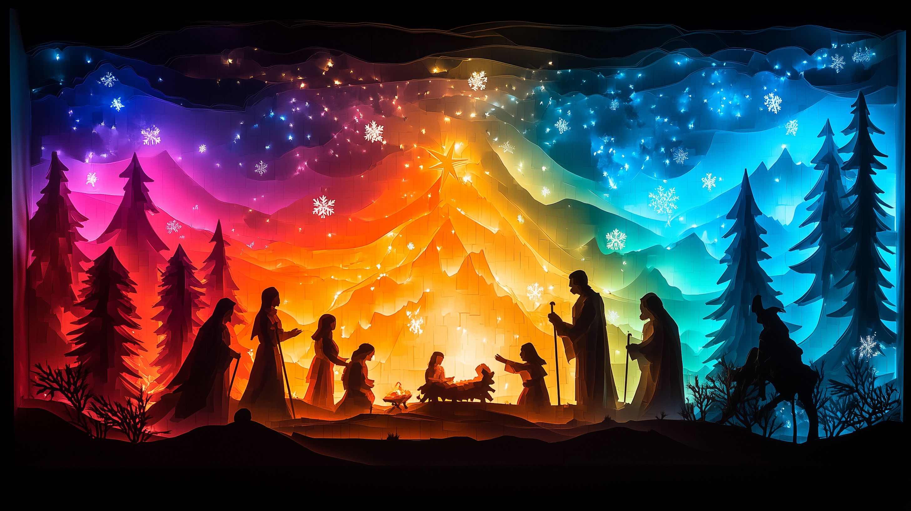 Dieses farbenprächtige Bild zeigt eine malerische Weihnachtskrippendarstellung vor einer atemberaubenden Naturkulisse. Im Vordergrund sind die Silhouetten der Heiligen Familie und ihrer Begleiter zu sehen, umgeben von einem Sternenhimmel in strahlenden Regenbogenfarben. Das Licht der Krippe erstrahlt inmitten einer mystischen Winterlandschaft mit verschneiten Wäldern und Bergen. Dieses einzigartige Foto vermittelt eine friedliche, fast magische Stimmung und lässt sich hervorragend als kostenloses Stockfoto für Weihnachtsthemen, Blogs, Newsletter oder Werbung einsetzen. Das hochauflösende Bild steht unter einer Creative-Commons-Lizenz zur freien Verwendung zur Verfügung.