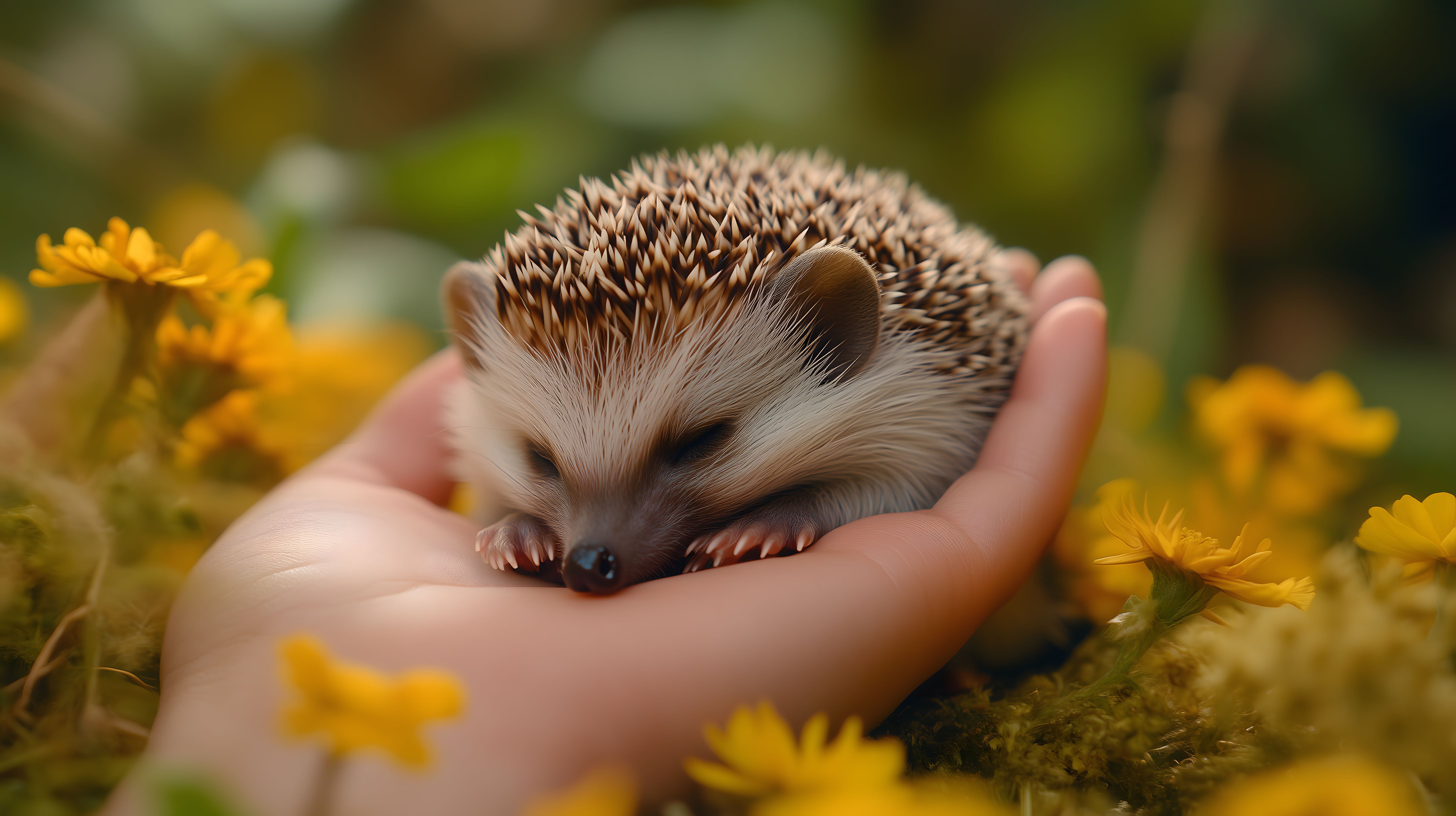 Das Bild zeigt einen niedlichen Igel, der sicher und geborgen in einer Hand ruht, umgeben von einer bunten Blumenwiese. Das stachelige Säugetier ist in einer Nahaufnahme zu sehen, wodurch seine zarte und sanfte Erscheinung besonders betont wird. Die gelben Blüten im Vordergrund und das saatte Grün des Mooses schaffen eine friedliche und harmonische Szenerie. Dieses Stockfoto eignet sich hervorragend für den Einsatz in Blogbeiträgen, Newslettern oder Social-Media-Posts, die eine natürliche und liebevolle Atmosphäre vermitteln möchten. Mit seiner hohen Auflösung und der Lizenz unter Creative Commons lässt es sich kostenfrei für eine Vielzahl an Projekten verwenden.