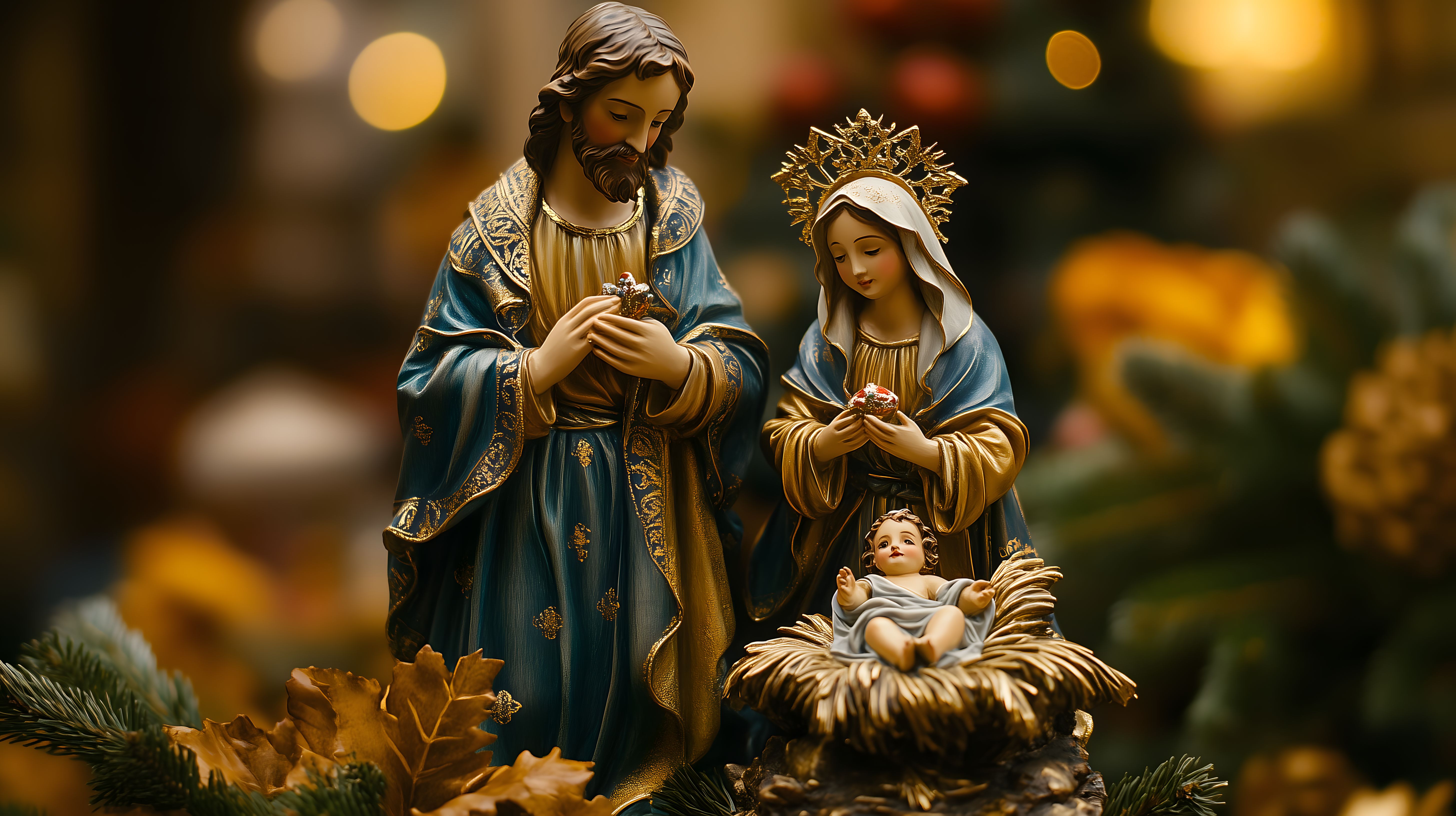 Dieses detaillierte Bild zeigt eine traditionelle Krippen-Szene mit der heiligen Familie - Maria, Josef und dem Jesuskind. Die Figuren sind liebevoll gestaltet, mit feinen Textilgewändern, goldenen Elementen und einem strahlenden Heiligenschein über Marias Haupt. Die Szene ist in einem warmen, goldenen Licht getaucht, mit verschwommenen Lichtpunkten im Hintergrund, die eine feierliche und stimmungsvolle Atmosphäre schaffen. Dieses Stockfoto in hoher Auflösung eignet sich hervorragend für die Verwendung in Blogs, Newslettern, Social-Media-Beiträgen oder Werbematerialien mit Bezug zur Weihnachtszeit, Dekoration oder christlichen Traditionen. Es steht unter einer Creative-Commons-Lizenz zur freien Nutzung zur Verfügung.