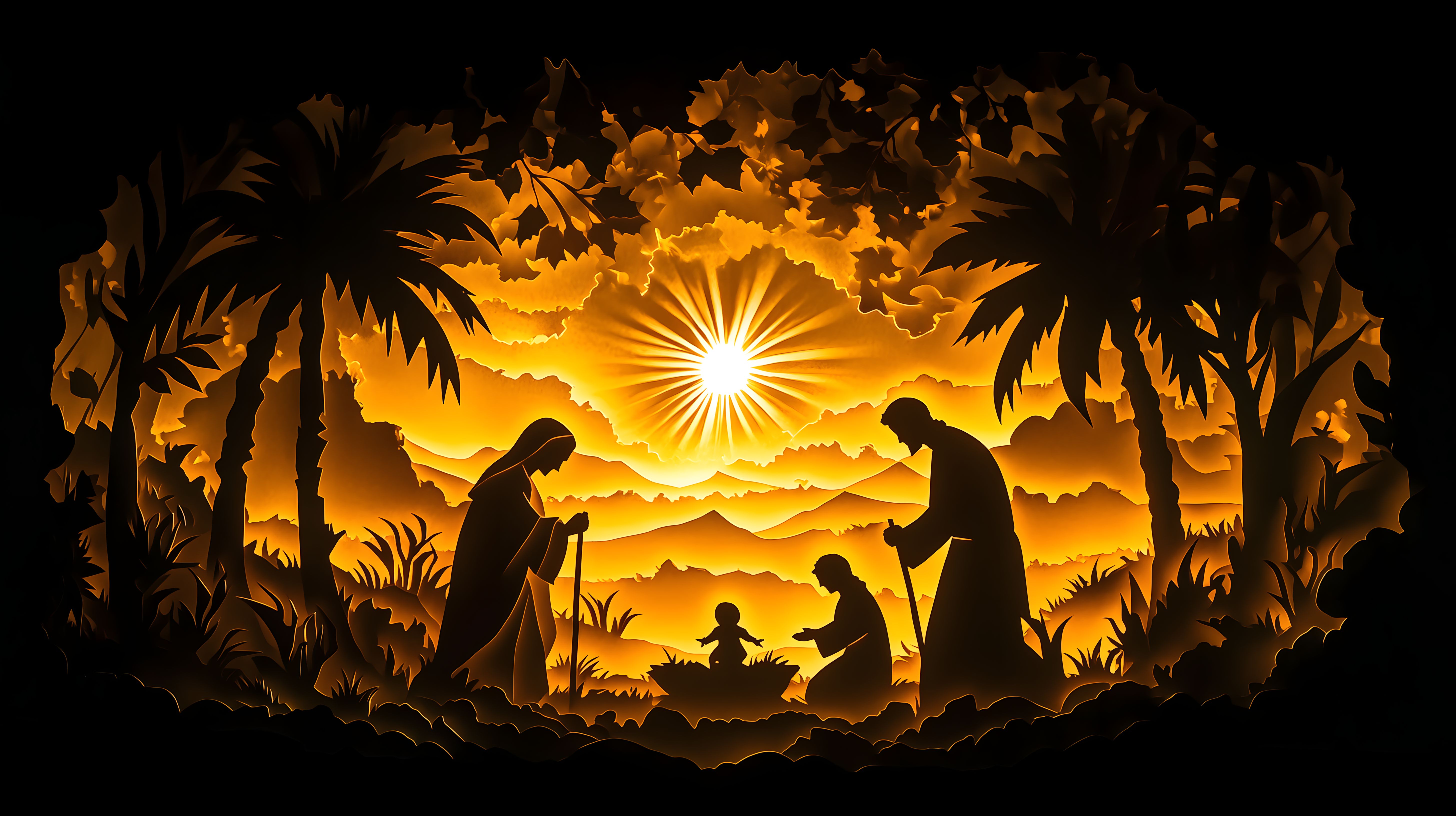 Dieses farbenfrohe und detailreiche Stockfoto zeigt eine stimmungsvolle Krippenszene mit der Heiligen Familie in einer märchenhaften Landschaft. Im Vordergrund sieht man die Silhouetten von Maria, Josef und dem Jesuskind vor einem strahlenden Sonnenaufgang. Üppige Palmen und dunkle Schatten schaffen einen kontrastreichen Effekt, der die Szene fast wie eine fotorealistische Illustration erscheinen lässt. Die orangefarbenen Töne und das weiche Licht verleihen dem Bild eine warme, geheimnisvolle Atmosphäre, die sich hervorragend für die Verwendung in Weihnachts- oder Advent-Dekorationen, Grußkarten, Blogbeiträgen oder Social-Media-Posts eignet. Dieses hochauflösende Stockfoto steht unter einer Creative-Commons-Lizenz kostenlos zum Download bereit.