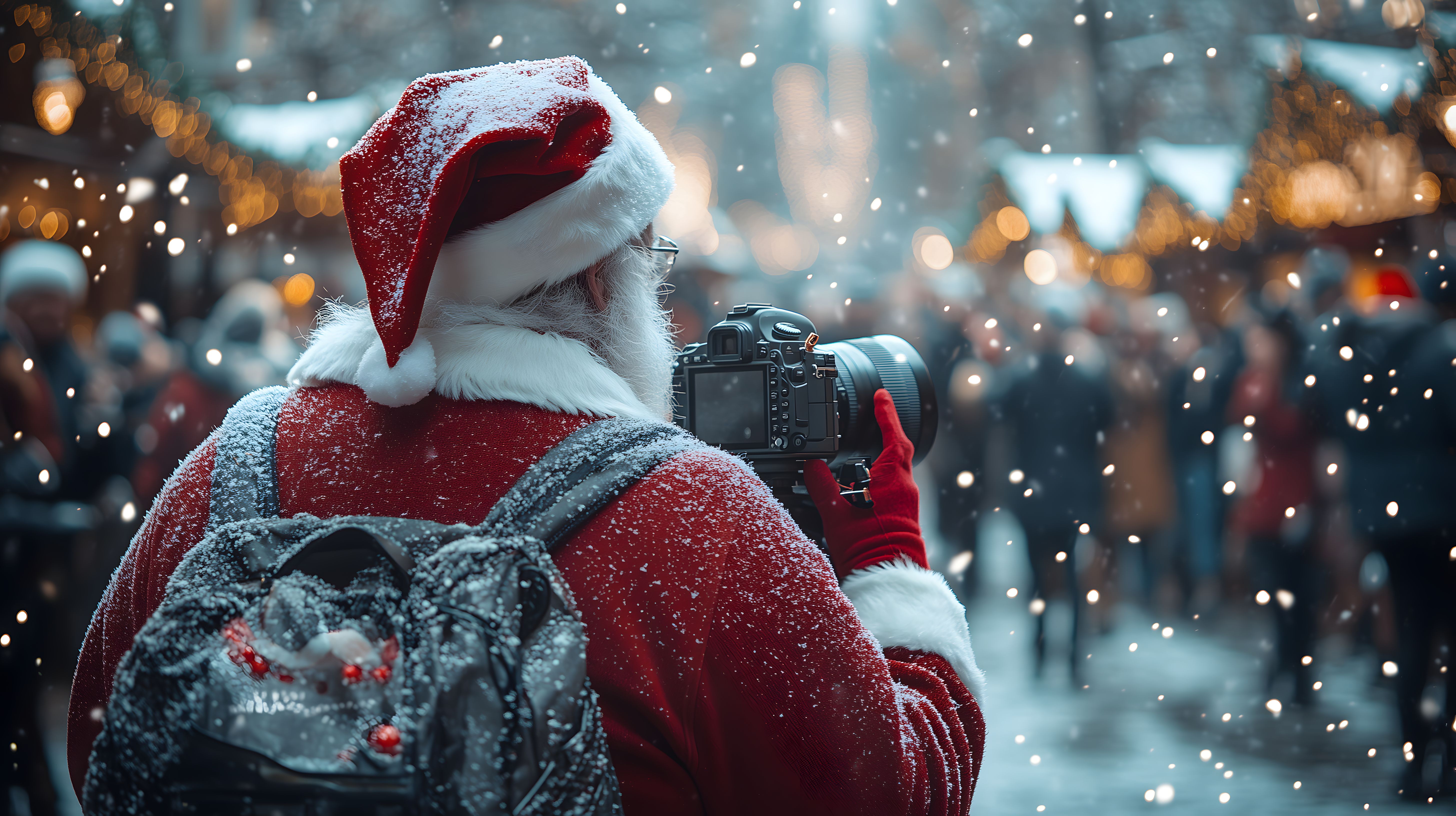 Das Foto zeigt einen Weihnachtsmann in voller Montur, der mit einer Kamera auf einem winterlichen Weihnachtsmarkt fotografiert. Der Weihnachtsmann trägt einen roten, schneebedeckten Mantel und Mütze und hält eine hochwertige Spiegelreflexkamera in den Händen. Im Hintergrund sind verschwommene Lichterketten und eine festliche Weihnachtsatmosphäre mit fallenden Schneeflocken zu sehen.