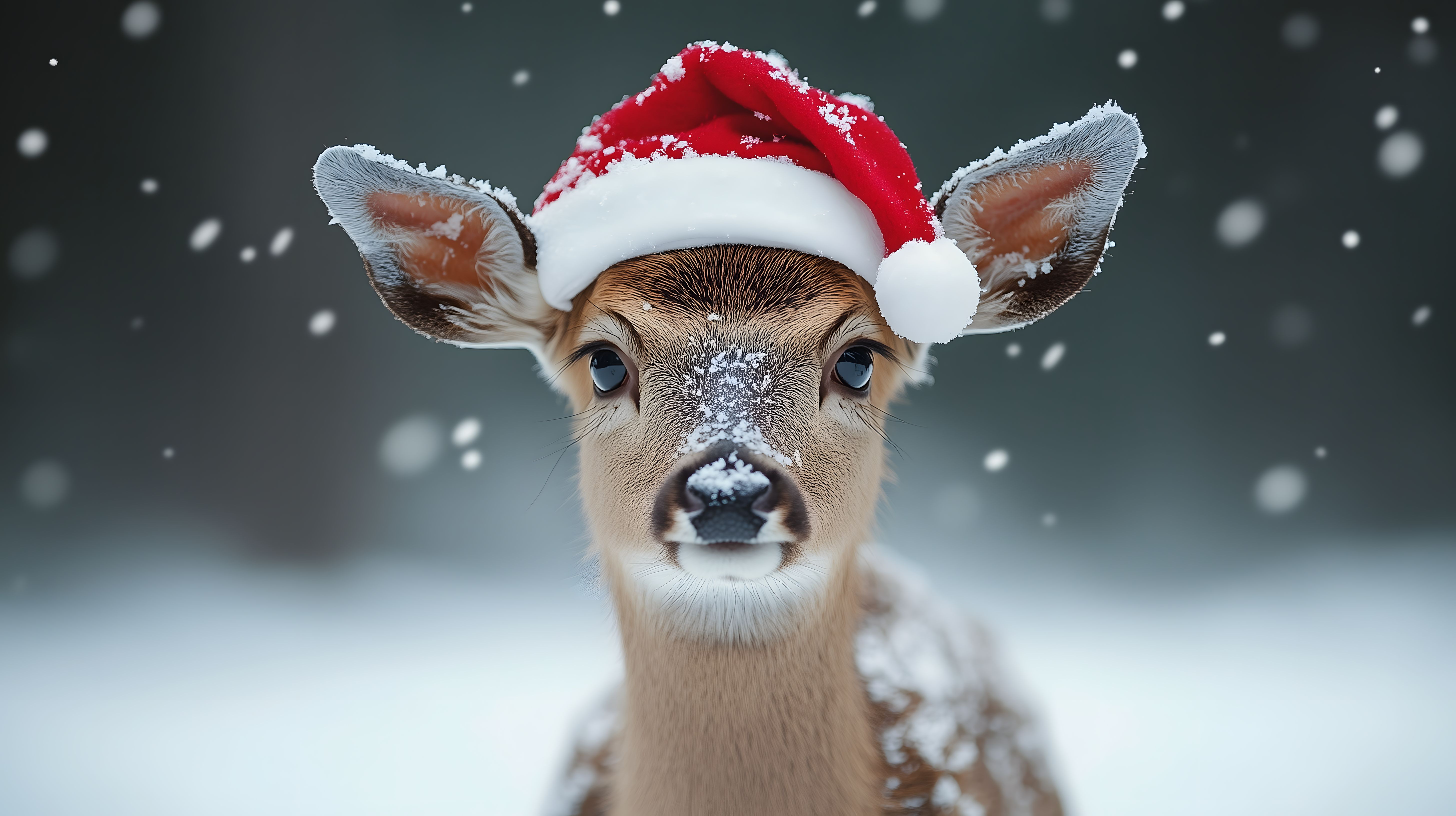 Das Foto zeigt ein Rentier mit einer roten Weihnachtsmütze, das inmitten eines verschneiten Hintergrundes zu sehen ist. Der Fokus liegt auf dem Kopf des Tieres, das mit großen, dunklen Augen in die Kamera blickt. Die feinen Schneekristalle, die auf dem Fell des Rentiers liegen, verleihen dem Bild einen winterlichen und stimmungsvollen Charakter.