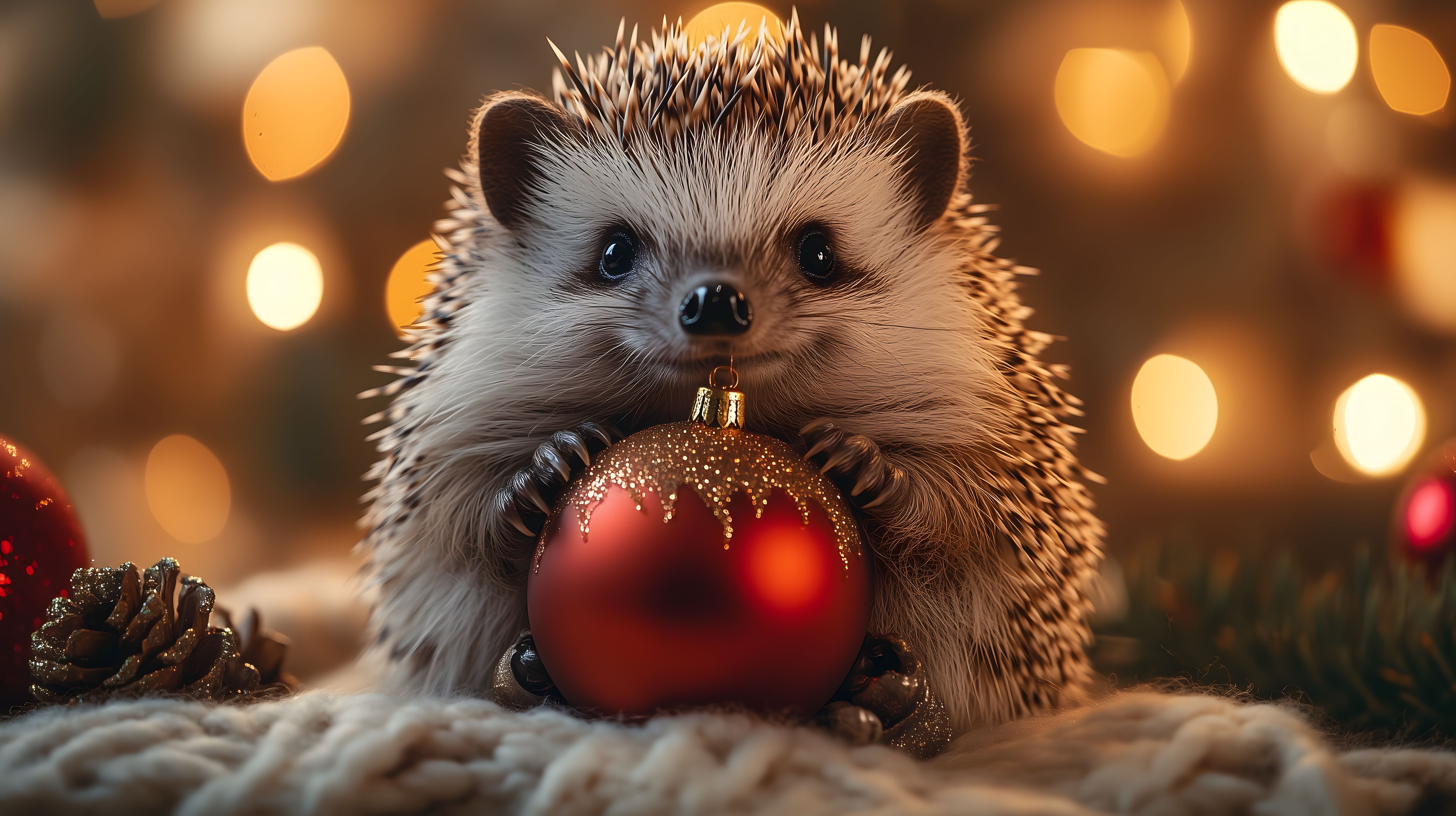 Das Foto zeigt einen entzückenden Igel, der eine rote, glitzernde Weihnachtskugel in seinen Vorderpfoten hält. Der Igel ist vor einem verschwommenen, warmen Hintergrund mit Bokeh-Effekt platziert, der eine festliche und gemütliche Atmosphäre schafft. Der Igel blickt direkt in die Kamera, wodurch er noch niedlicher und charmanter erscheint. Neben der Weihnachtskugel befinden sich einige Tannenzapfen, die das winterliche Thema unterstreichen. Dieses Bild eignet sich hervorragend für die Verwendung in Weihnachtsdekorationen, Grußkarten, Newslettern oder als hochwertiges, kostenloses Stockfoto für diverse Werbezwecke in hoher Auflösung und unter Creative-Commons-Lizenz.