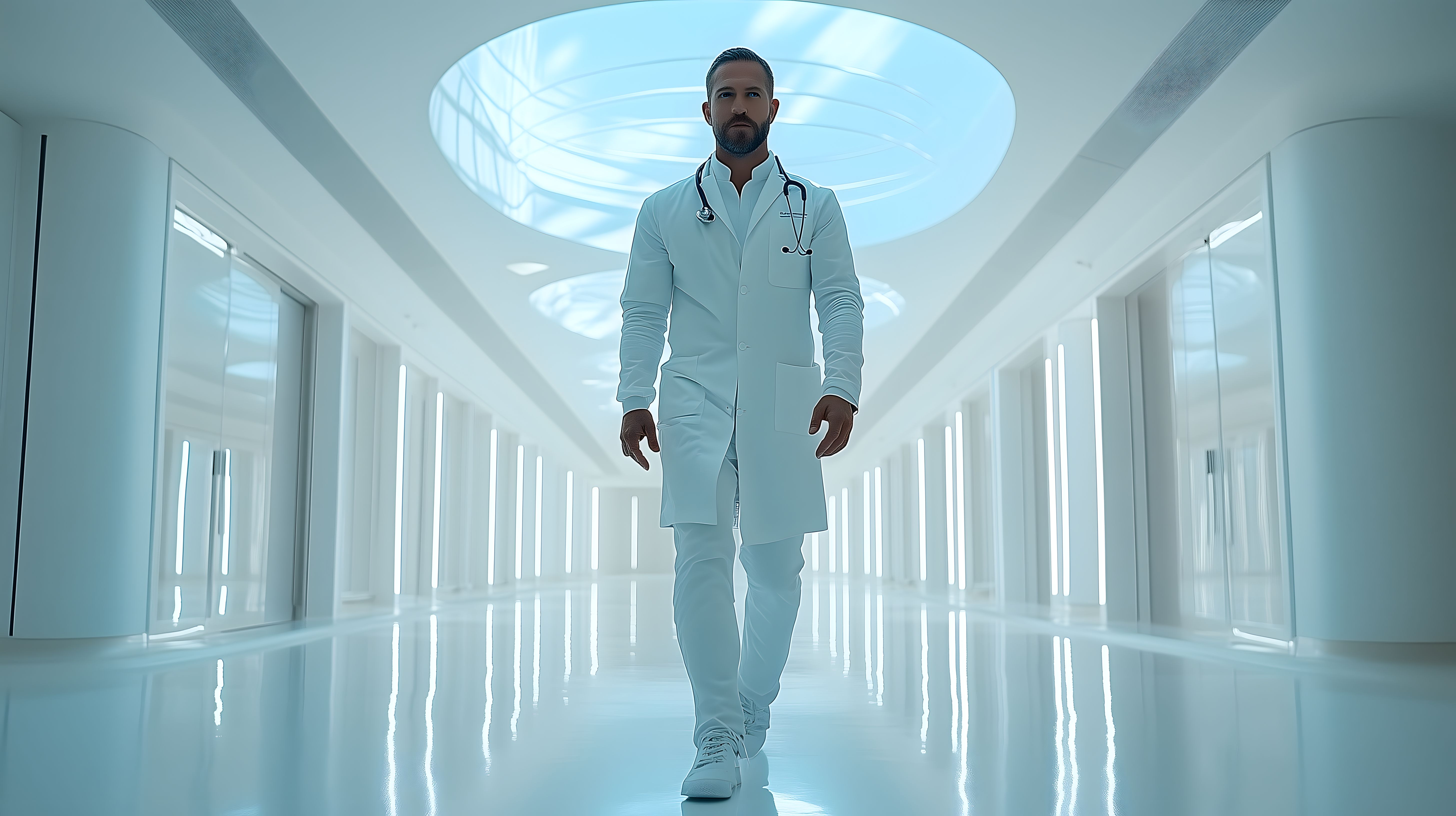 Das Bild zeigt einen Arzt oder Doktor, der einen hell erleuchteten Krankenhausflur durchquert. Der Mann trägt eine weiße medizinische Uniform mit einem Stethoskop um den Hals. Der Flur ist durch große Glasfronten sehr licht und freundlich gestaltet. Der Eindruck ist modern, sauber und einladend. Das Foto könnte für verschiedene Zwecke wie Blogbeiträge, Werbekampagnen oder Unternehmensdarstellungen im Gesundheitswesen eingesetzt werden.