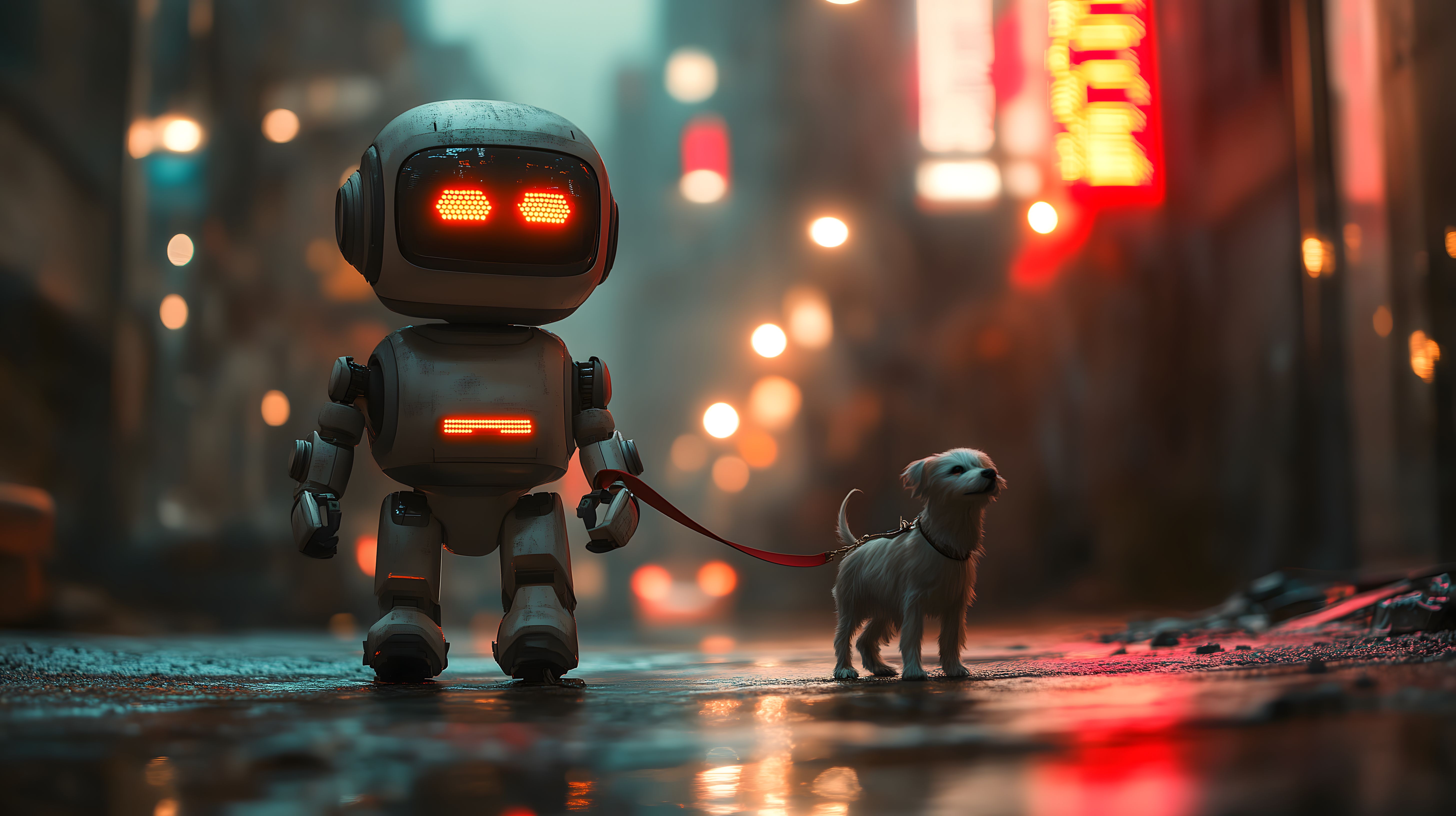Dieses faszinierende Bild zeigt einen Roboter, der an der Leine eines kleinen Hundes durch eine stimmungsvolle Nachtstadt spaziert. Vor dem Hintergrund leuchtender Straßenlaternen und Neonreklamen entsteht eine beeindruckende, futuristische Szenerie, die Technik und Natur auf harmonische Weise miteinander vereint. Mit seiner detaillierten Darstellung und der atmosphärischen Beleuchtung lädt dieses hochauflösende Stockfoto zu kreativen Verwendungen in Blog-Beiträgen, Newslettern oder Werbematerialien ein. Es steht unter einer Creative-Commons-Lizenz kostenlos zur Verfügung.