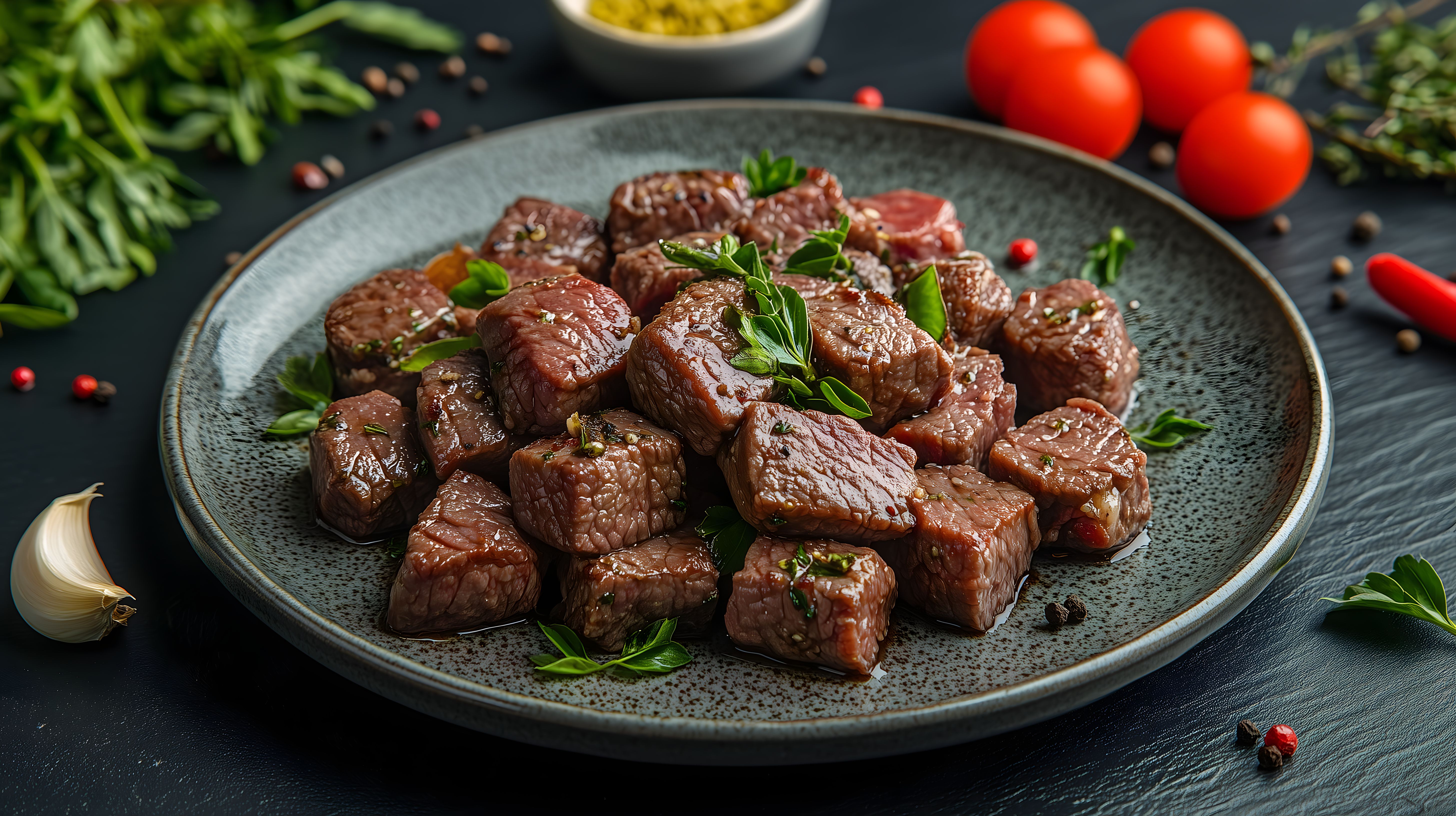 Das Bild zeigt frisch zubereitete Rindfleischstücke auf einem grauen Teller. Die Fleischstücke sind mit grünen Kräutern und roten Gewürzen garniert, was dem Gericht einen appetitlichen, rustikalen Charakter verleiht. Der dunkle Hintergrund betont die Tiefe und Farben des Gerichts und verleiht ihm eine stimmungsvolle Atmosphäre. Dieses hochwertige Stockfoto eignet sich hervorragend für Rezeptseiten, Kochbücher, Food-Blogs oder -Werbung, da es die Zubereitung von Rindfleisch in einer authentischen, verlockenden Art und Weise präsentiert. Das Foto ist in hoher Auflösung und unter einer Creative-Commons-Lizenz für die Verwendung in verschiedenen Projekten frei verfügbar.