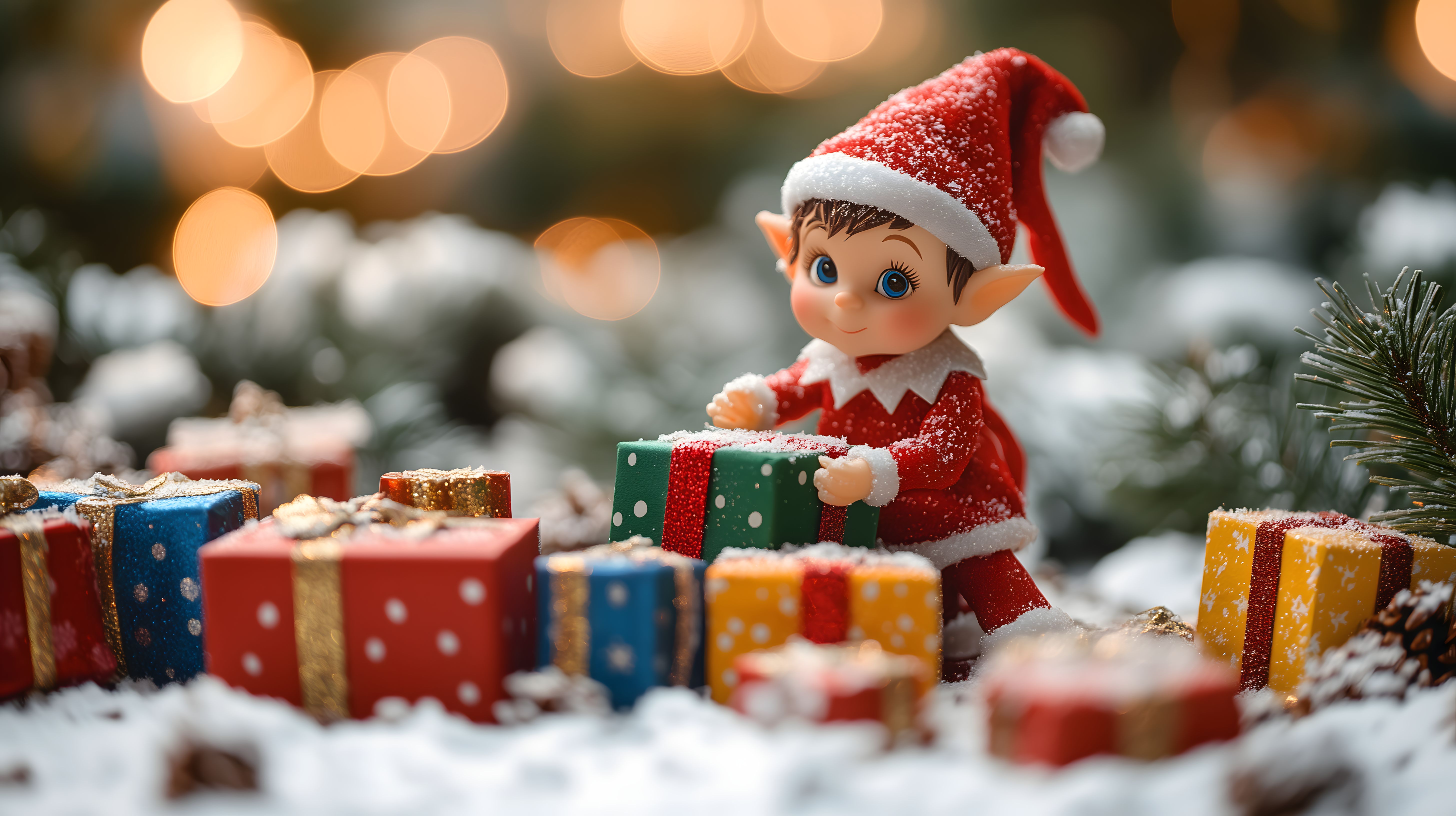 Das Bild zeigt einen niedlichen Weihnachtsmann-Elf, der mit einem Geschenkpaket in der Hand vor einem winterlichen Hintergrund mit Schnee und Tannenzweigen steht. Der Elf trägt ein rotes Kostüm mit Mütze und hat einen fröhlichen, lächelnden Gesichtsausdruck. Der Bokeh-Hintergrund verleiht dem Bild eine festliche und gemütliche Stimmung. Dieses hochauflösende Stockfoto ist perfekt für Weihnachtsdekorationen, Grußkarten, Werbematerial oder Social-Media-Beiträge rund um die Feiertage. Es steht unter der Creative-Commons-Lizenz zur kostenlosen Nutzung zur Verfügung.