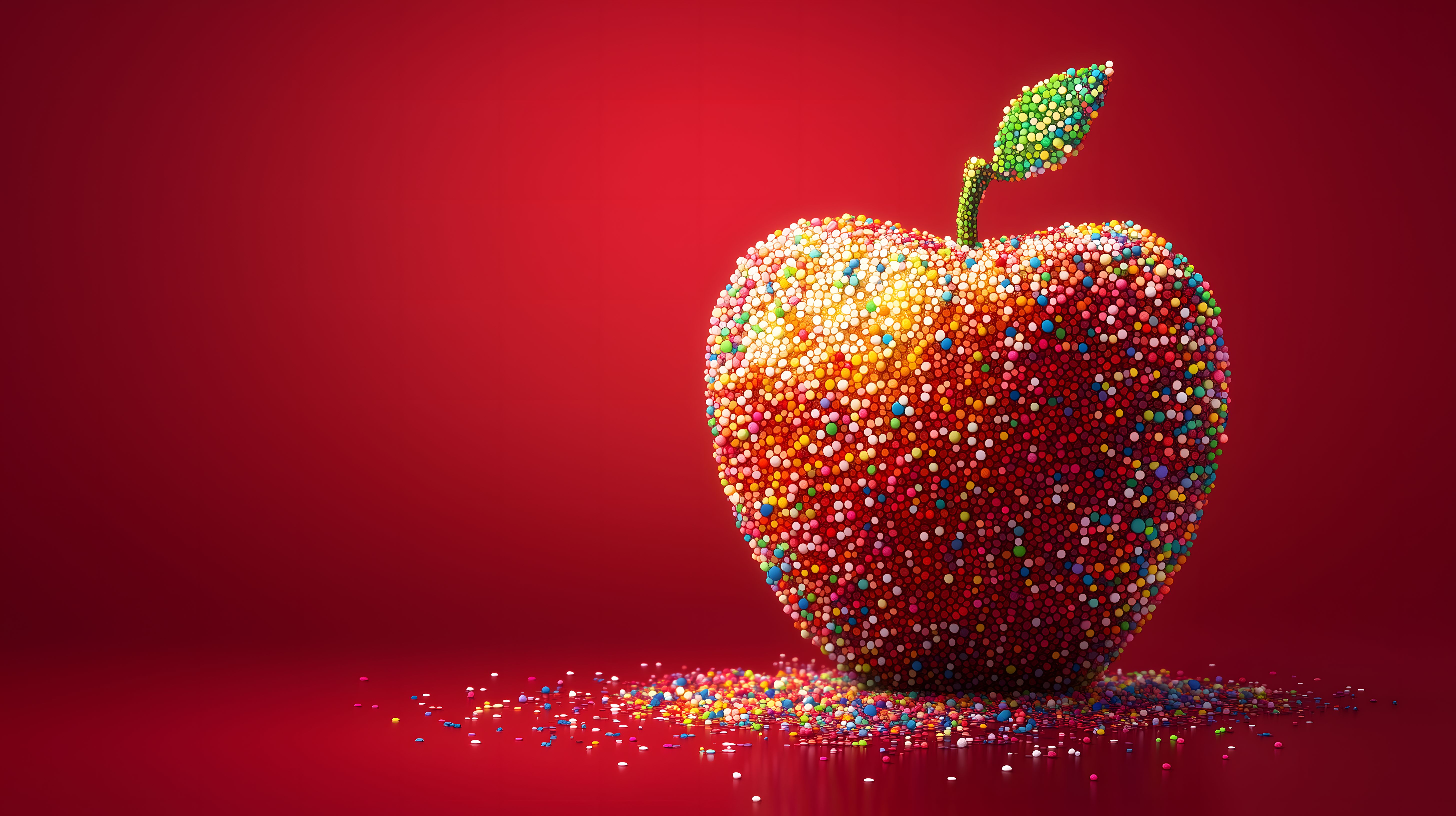 Dieses farbenfrohe Bild zeigt einen Zuckerapfel, der vollständig mit bunten Perlen überzogen ist. Die Perlen in verschiedenen Rottönen, Orange- und Gelbtönen sowie Grüntönen verleihen dem Apfel ein einzigartiges, abstraktes Erscheinungsbild. Der Apfel scheint wie aus Kristallen oder Diamanten zu bestehen und vor einem intensiv roten Hintergrund zu schweben. Dieses Foto eignet sich hervorragend als kreatives Stockfoto für Blogbeiträge, Newsletter, Social-Media-Posts oder Werbematerialien in den Bereichen Kreativität, Inspiration oder Süßigkeiten. Das Bild ist in hoher Auflösung verfügbar und kann unter einer Creative-Commons-Lizenz kostenlos für kommerzielle und nichtkommerzielle Zwecke genutzt werden.